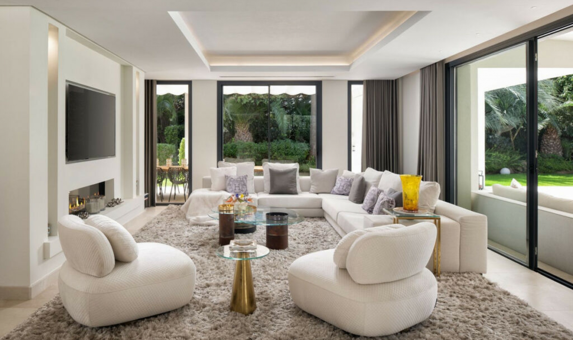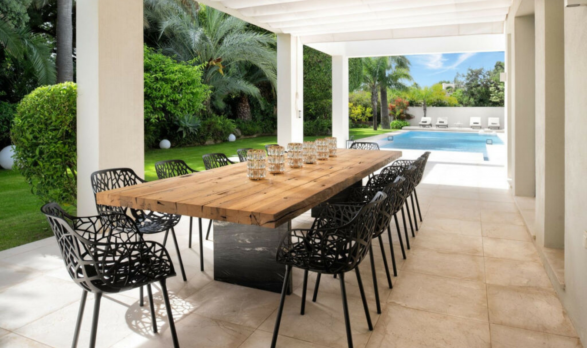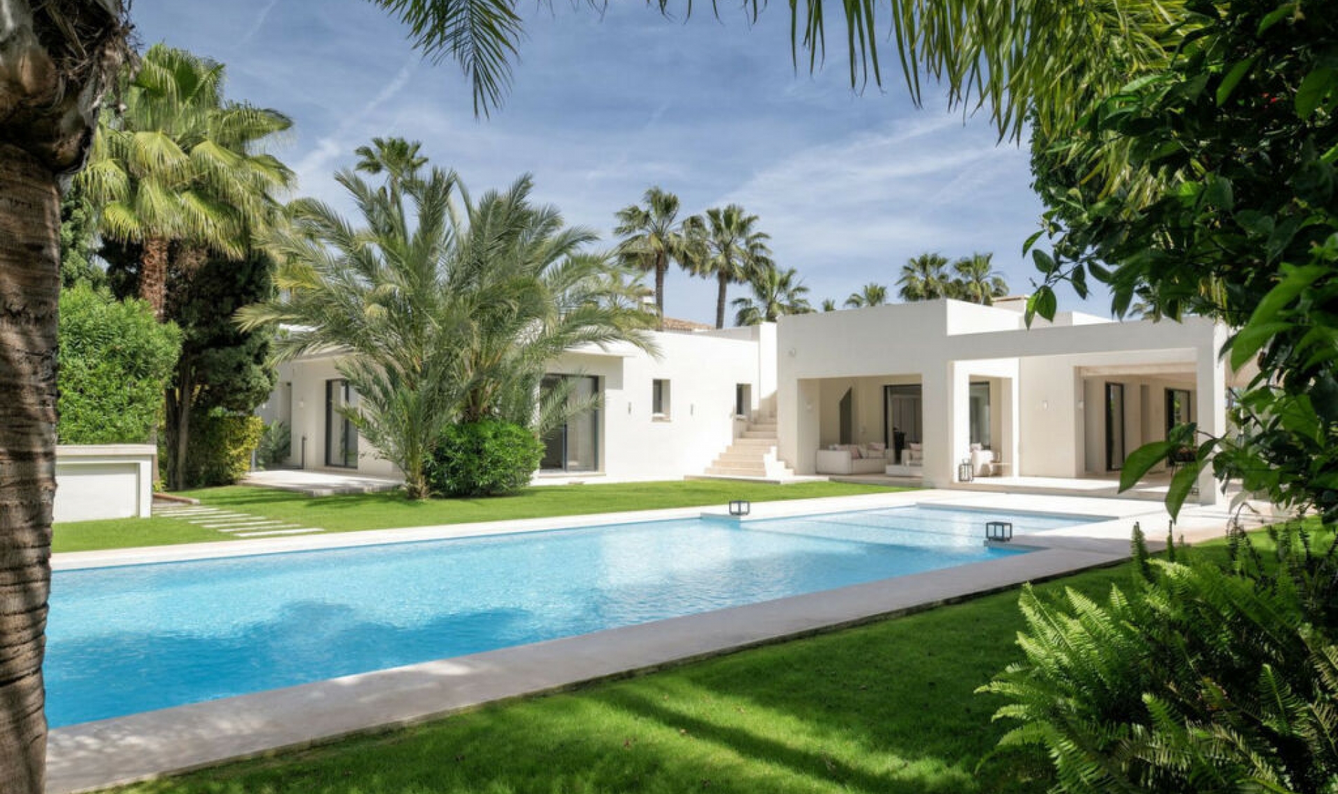 This is more than a home—it's a piece of paradise. Situated on the largest plot in Marbesa at 2․500 m² of tropical gardens, this stunning one-level villa of 650 m² combines luxury, elegance, and warmth. With fi ve spacious bedrooms, fi ve en suite bathrooms, and two extra toilets, every corner of this home is designed to impress. As you step inside, you're greeted by an expansive, open-plan living area fi lled with natural light. The chic designer furniture and large windows complement the warm, serene ambiance, making it a perfect space for both relaxation and entertaining. With everything on one level, the fl ow of this home is remarkable. The heart of the home, the living space, opens up to the outdoors, where the beauty of the property truly comes alive. Both the home and the large inviting pool area are surrounded by stunning exotic gardens fi lled with palm trees, fruit trees, and exquisite fl owers—creating a peaceful energy that resonates in every corner, truly hard to fi nd elsewhere. The property includes a fully equipped gym with a sauna and two adaptable rooms that can be easily converted into anything you desire, located near the indoor garage, which has space for two cars. Additionally, there is space for two extra cars in the outdoor parking area. The property is also equipped with solar panels, making it both energy-effi cient and cost-friendly. Imagine waking up to the soft sounds of nature, enjoying a peaceful morning stroll, and knowing the beach is less than fi ve minutes away on foot. This is a lifestyle of luxury and serenity in one of Marbella East's most sought-after areas. This is a unique property, destined for the client who demands nothing less than extraordinary.