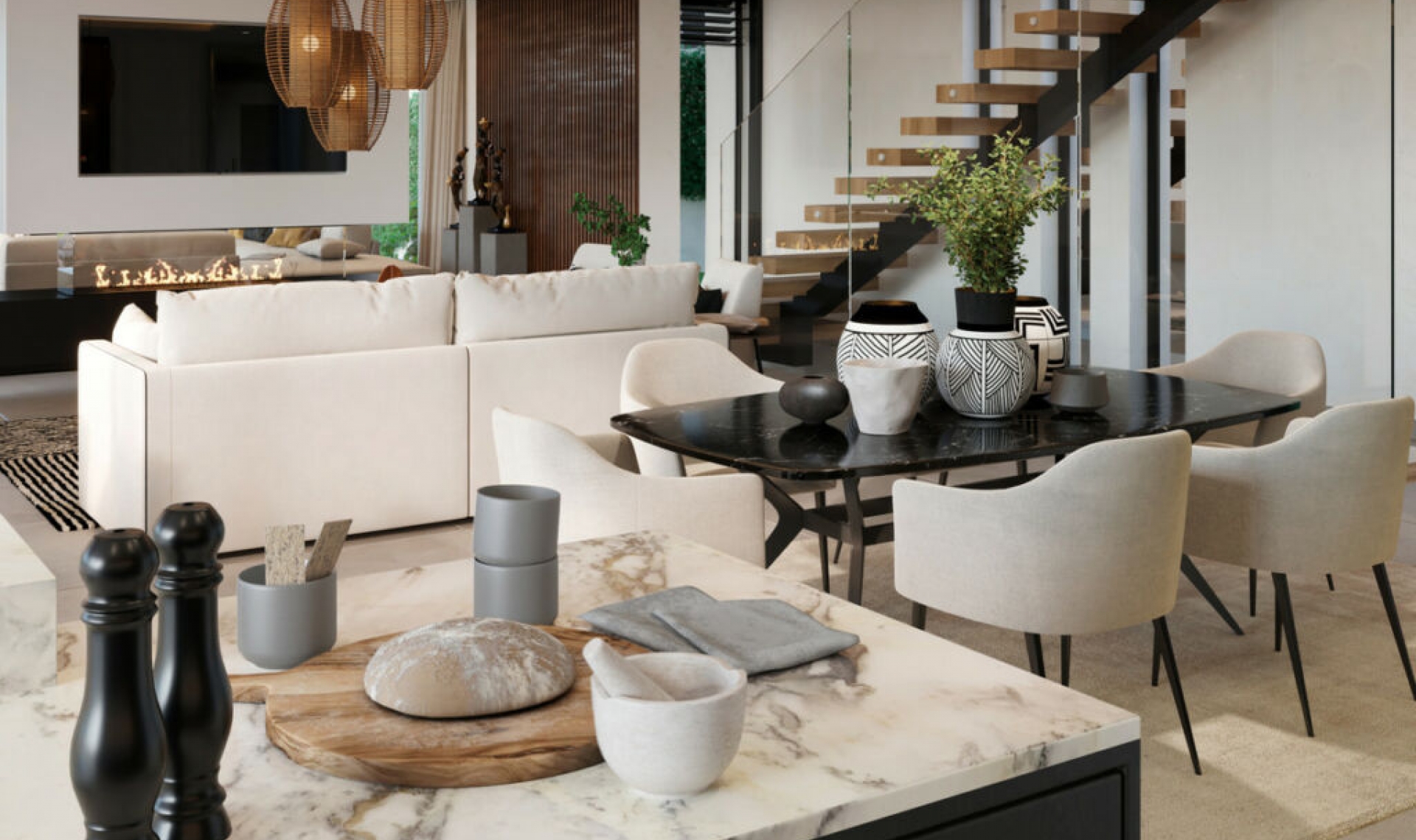 New Development: Prices from 2․950․000 € to 3․500․000 €. [Beds: 4 - 5] [Baths: 4 - 5] [Built size: 508․00 m2 - 528․00 m2] Luxury villa with 180° undisturbed sea views for sale in La Capellania, Benalmadena The vision of this villa is to infuse the excellence of Danish craftsmanship, materials, and construction techniques here on Costa del Sol. Features Include: ✔ 4 bedrooms ✔ 4 bathrooms ✔ 2 guest toilets ✔ 535m² built ✔ 764m² plots ✔ Garage for 2 cars with elevator ✔ Infinity pool. Prime location just 15 minutes from the airport of Malaga and 20 minutes from Marbella, in a very charming and well established area, with beautiful traditional white spanish villas and green gardens surrounding. Enjoy close proximity to beautiful beaches, world-class golf courses, gourmet restaurants, and vibrant cultural attractions. The villa features a ground floor with a spacious open-plan kitchen and living area, leading to expansive terraces equipped with outdoor BBQ areas and a chill-out zone by the infinity pool, showcasing incredible 180-degree views of the Mediterranean Sea. The upper floor include a master suite with a private terrace, plus three additional bedrooms, each with en-suite bathrooms. The basement offers a large garage with space for two cars and the potential to add a cinema room, an extra bedroom, or a spacious activity room complete with a bar. All floors are connected by a private elevator, enhancing convenience and luxury in these stunning homes.