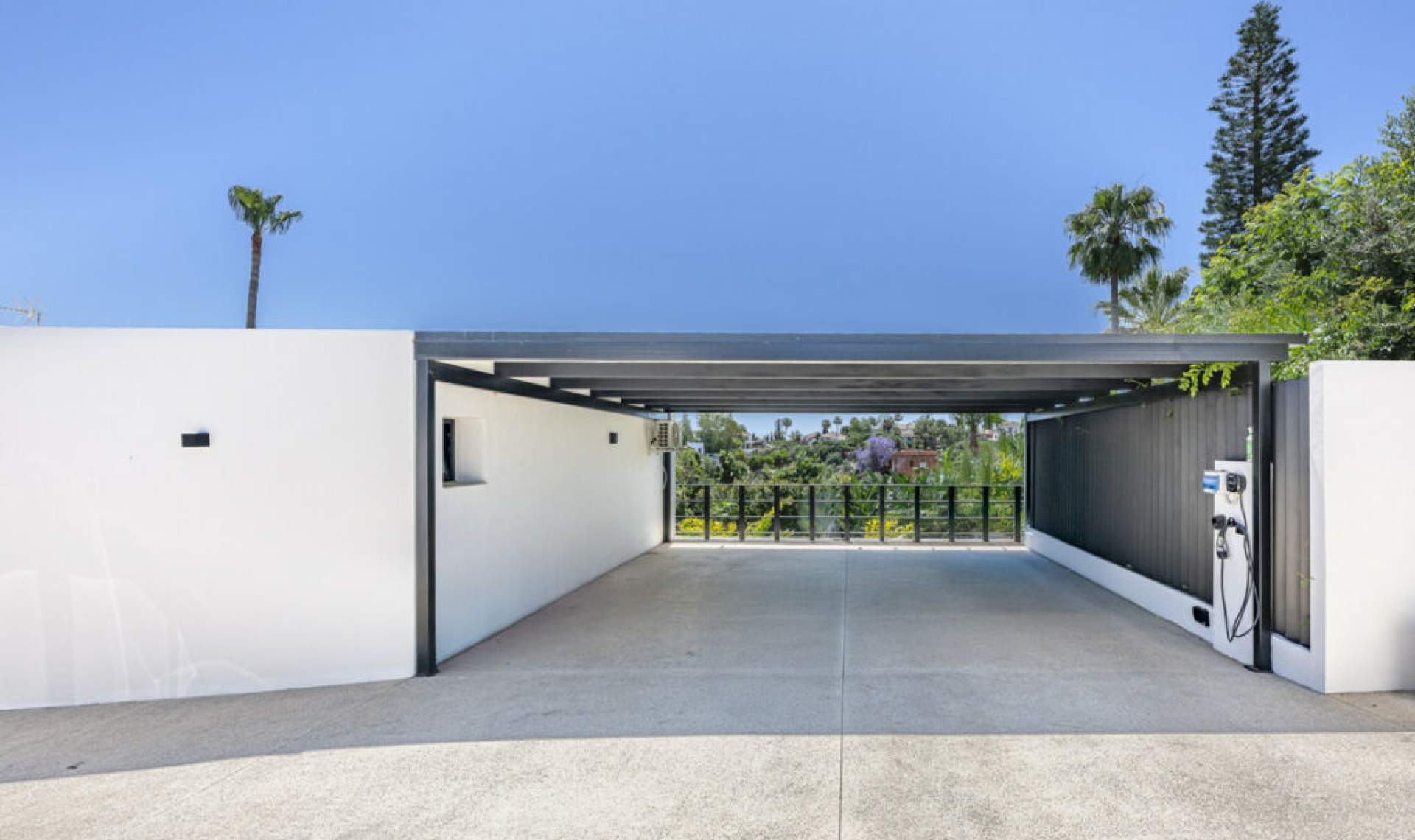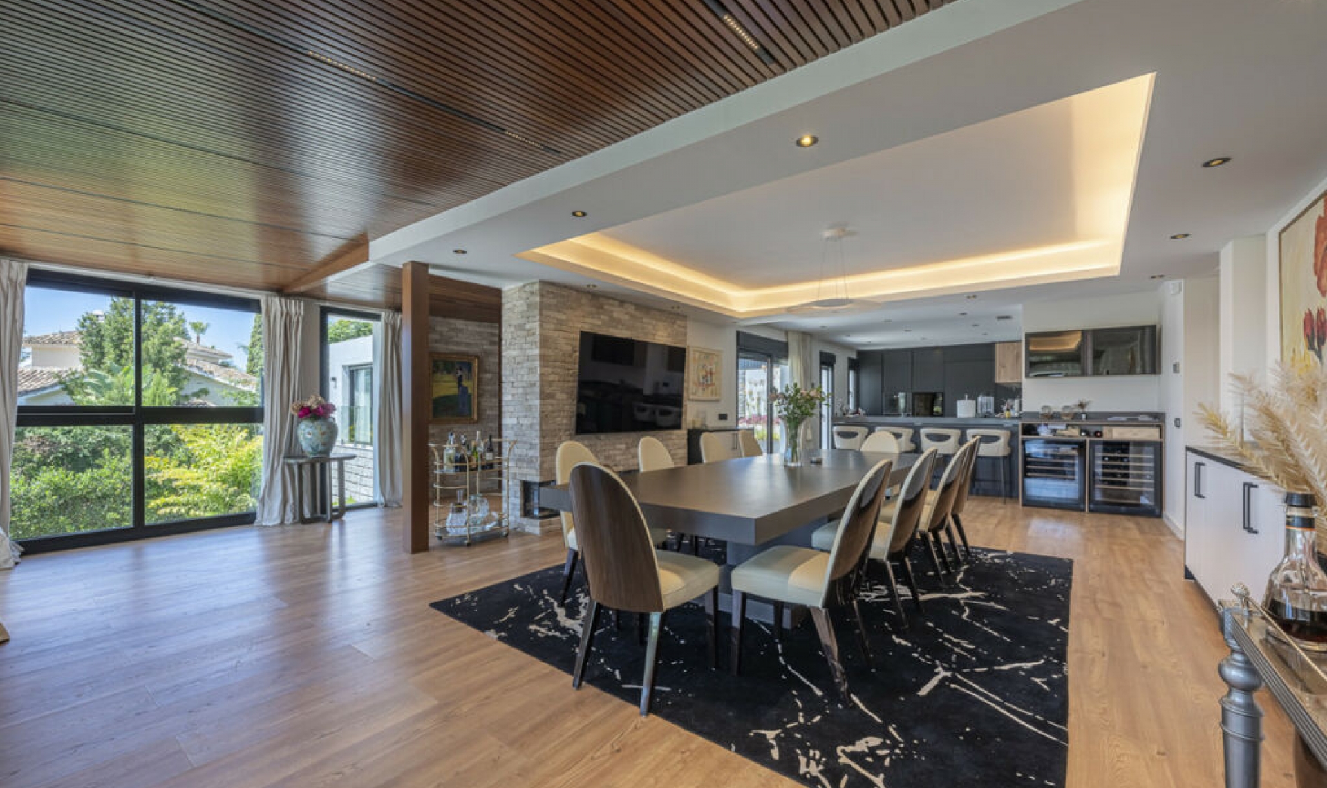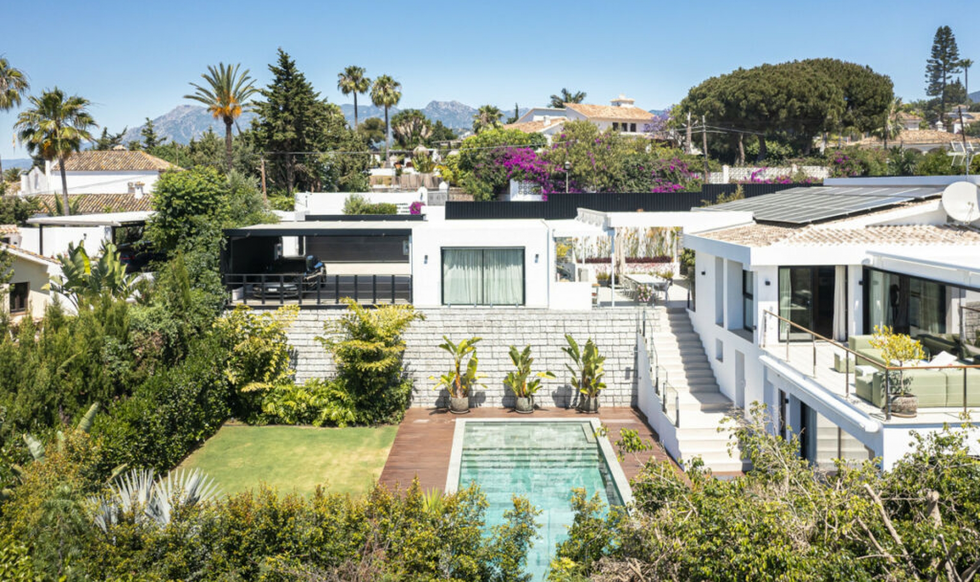 Presenting an exceptional villa in the sought-after El Rosario Urbanization on the esteemed Costa del Sol. This meticulously renovated property epitomizes luxury and stands as one of the premier residential areas on the eastern side of Marbella. Nestled in an enclave of villas surrounded by lush gardens, this residence prioritizes serenity. The villa boasts nearly 310 m2 of living space on a 1․065 m2 plot, featuring a pool, solarium, terraces with a covered outdoor kitchen, garden areas, and a covered garage. The residence features underfloor heating and electricity from advanced photovoltaic systems. Calacatta Venato marble adorns the exterior, and oak doors with an Iroko finish add elegance. The open-plan living and dining area seamlessly connects to a kitchen with wooden floors, creating an expansive space. The upper floor showcases three bathrooms with marble flooring and three bedrooms, two en suite, with illuminable wardrobes. The smaller bedroom is repurposed as a fitness area, while the main bedroom boasts a terrace with fitness equipment. The Gaggenau-equipped kitchen features top-of-the-line appliances and fine Moblapa wood furniture. Two guest flats with private entrance offer additional space. The villa includes a climate-controlled wine cellar and a newly constructed guest house with pure luxury and splendid views. The outdoor kitchen is equipped with exclusive all-weather technology and high-end appliances.