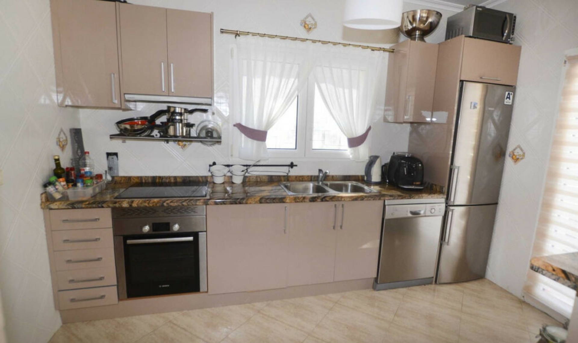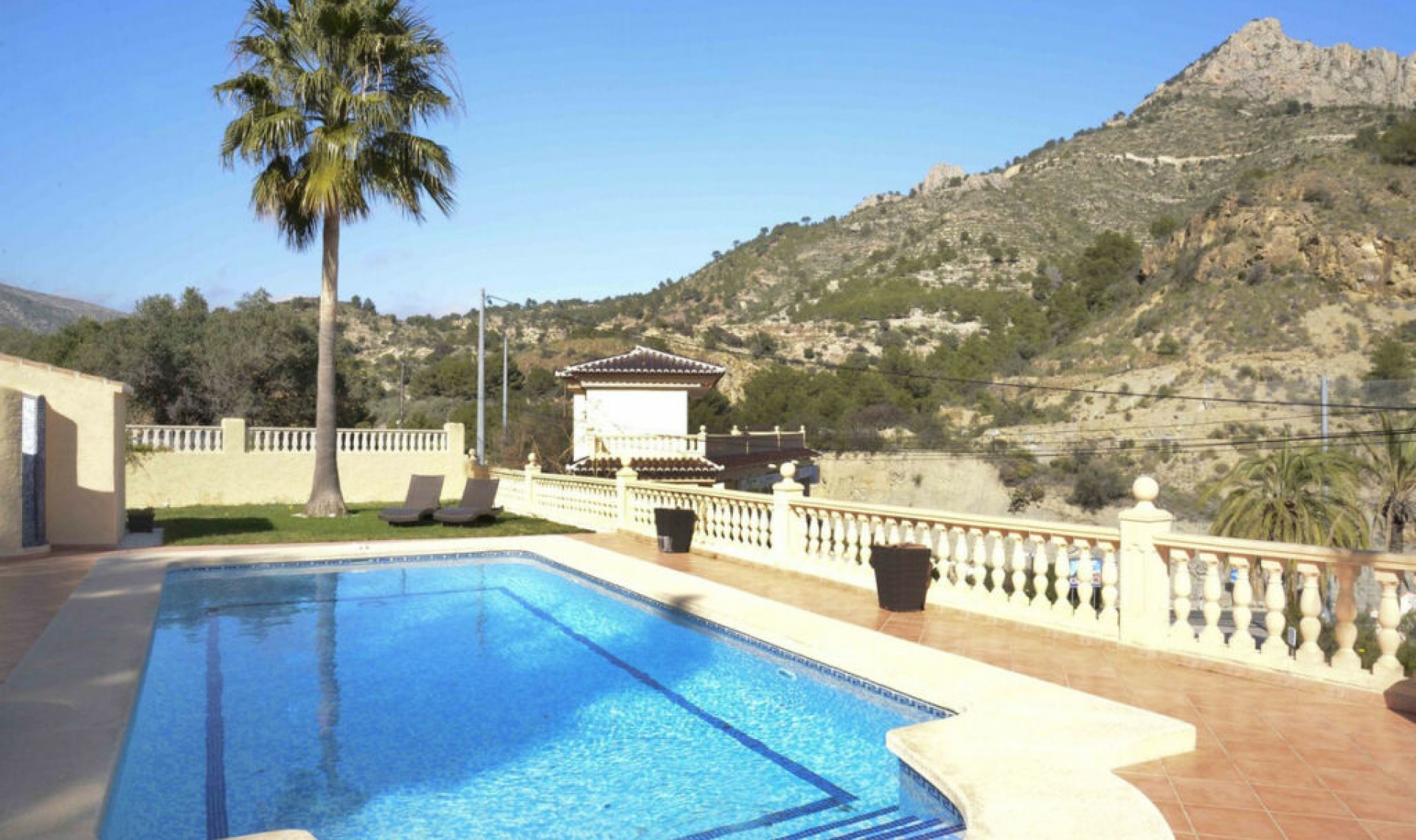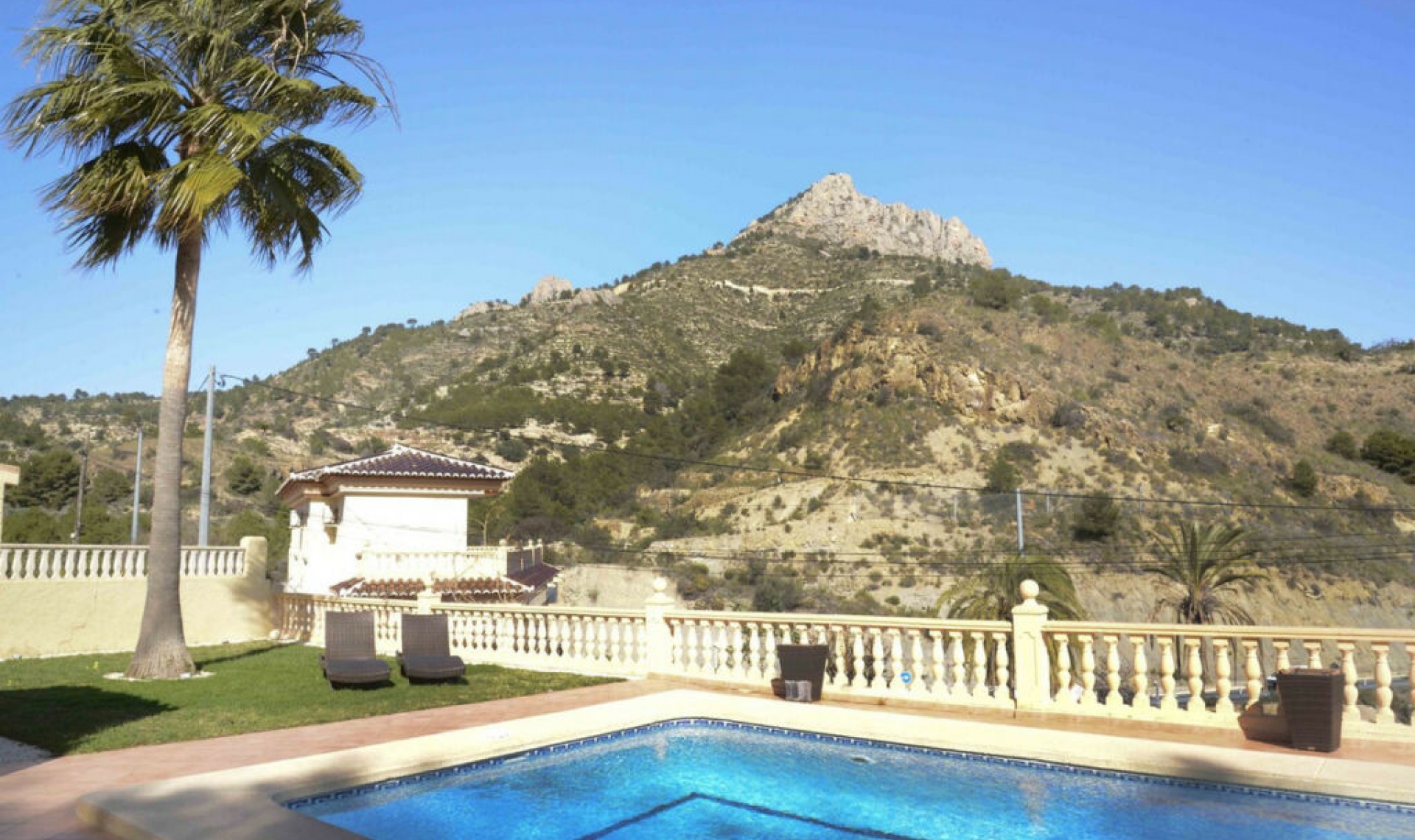 Sunny Mediterranean-style villa with the views to the sea and Peñón de Ifach, located on a private plot, in Maryvilla district, Calpe. The living space is distributed on the one floor, and includes: 3 double bedrooms, 2 bathrooms, fully equipped kitchen with access to the living room and dining room. Features include: split-type hot/cold air-conditioning, heating, fireplace, finishing with high-quality materials, fully equipped kitchen with appliances, fully equipped bathrooms, stone terraces, double glazing, broadband connection, satellite TV, outdoor shower, barbecue, garden lighting and much more. On the plot: easy-to-maintain garden with mature Mediterranean vegetation, swimming pool, shower, terraces, barbecue area, outdoor dining area, garage and driveway. Close to beaches, services and stores, restaurants, bars, supermarket, international schools, recreational facilities and much more.