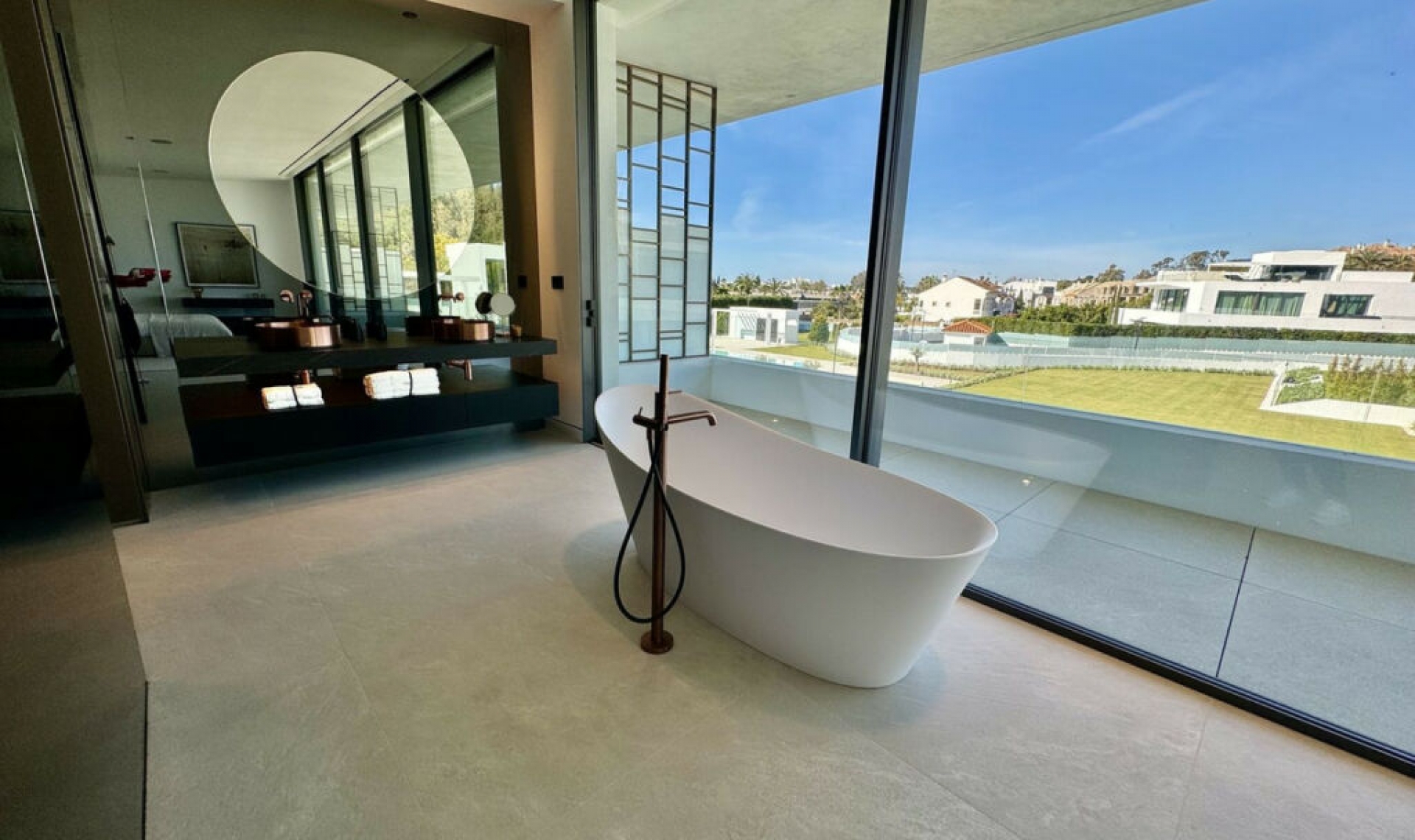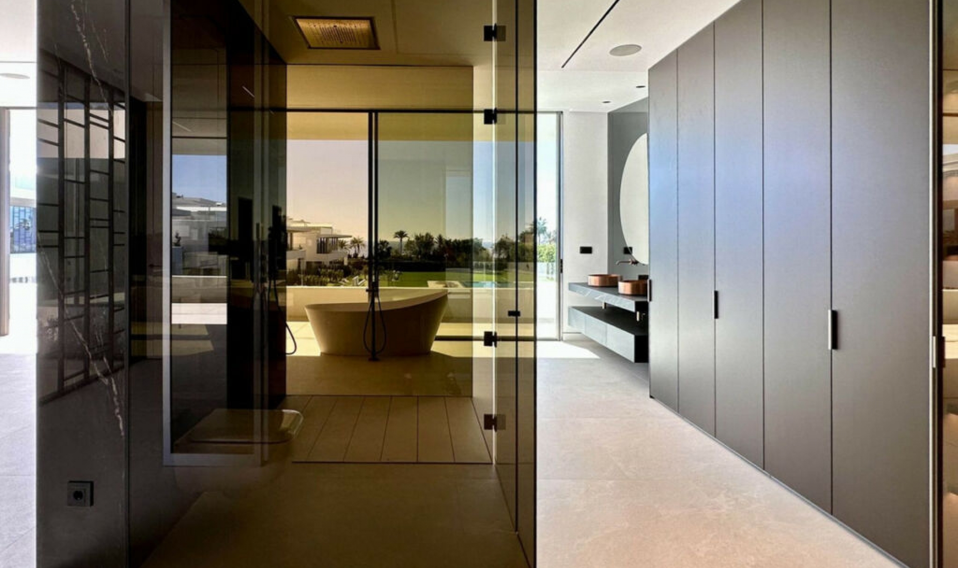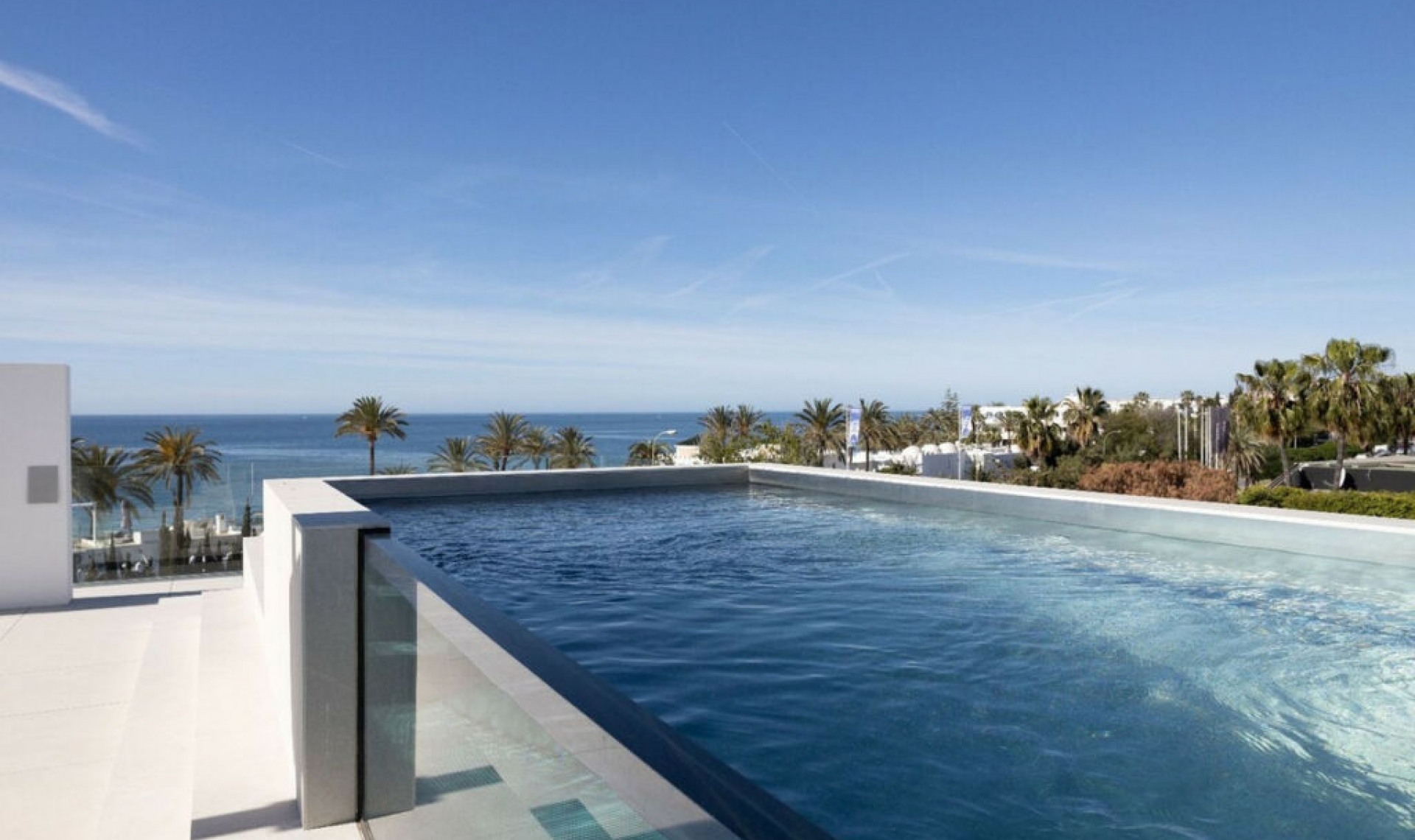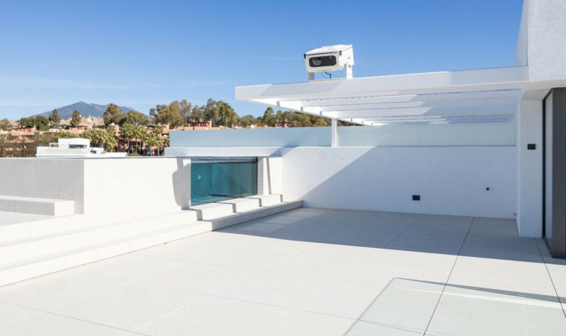 This magnificent Viila is located in a gated and secured residence of 12 Villas on the luxurious Marbella Golden Mile. It is ideal for those who seek comfort and luxury of one of the most prestigious areas of the entire Mediterranean region. Villa was built in 2023. The beautifully built Villa on 4 levels offers high quality, stylish and bright living room open to the large and elegant terrace with stunning panoramic views towards the sea. All 2 bedroom suites include floor-to-ceiling windows, oak flooring, Porcelanosa marble and hardware throughout, showcasing an elegant and refined modern style. A sleek minimalist kitchen has integrated Gaggenau appliances. All 4 levels are connected by a modern elevator. Terraces leading out to a private area of garden – as well as having access to the beautifully landscaped communal gardens and swimming pool. Roof terrace with private swimming pool and outdoor cinema. A customizable basement provides ample space for an additional third bedroom, a home gym or room for any other use, such as an office. Underground parking for 4 cars. It is facing south-west, admires spectacular views of the Mediterranean Sea, Puerto Banus marina and has the legendary La Concha Mountain as a background. Surrounded with high-end properties of the Golden Mile, this perfectly executed contemporary property is just 250 meters away from the sandy beach and an array of amenities, well-known restaurants and bars, 5-star iconic hotels like Puente Romano, designer boutiques, shops and supermarkets. Unique opportunity to own a contemporary villa – one of just 12 – with panoramic sea views set on the world-famous Golden Mile!