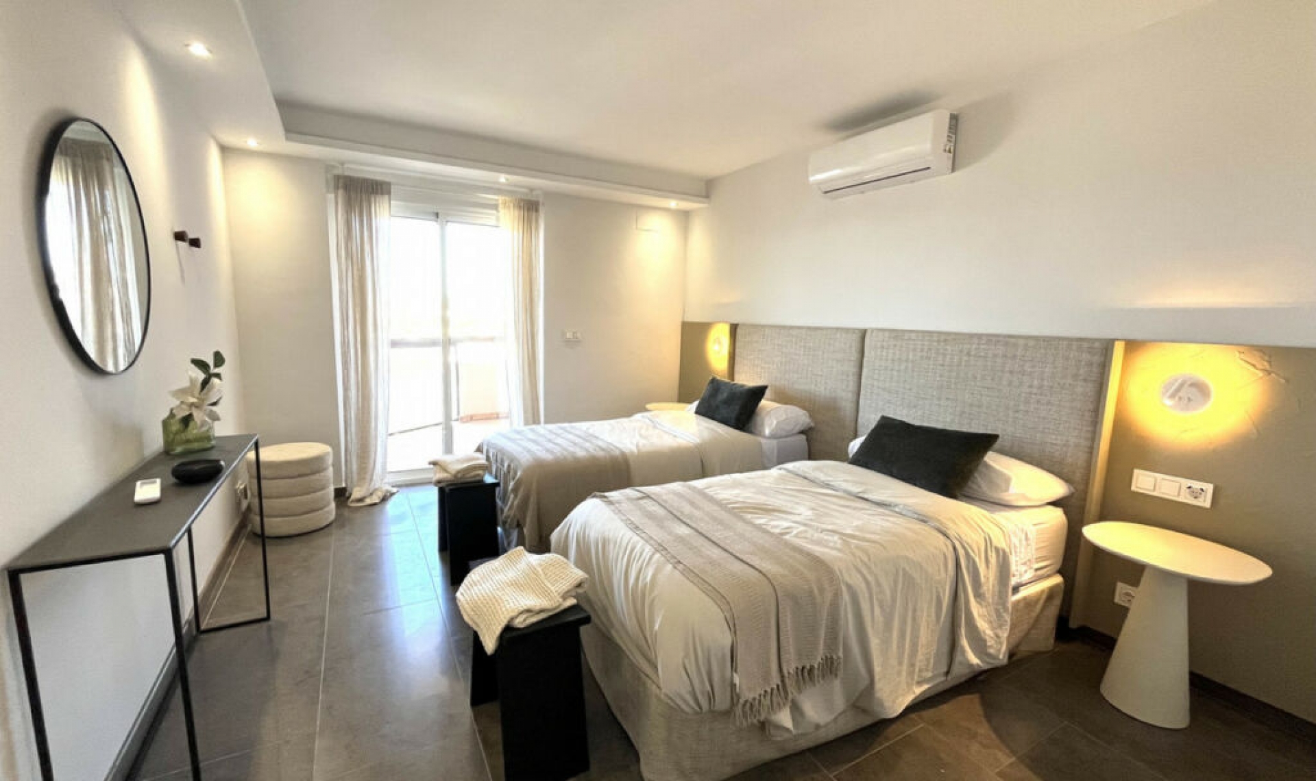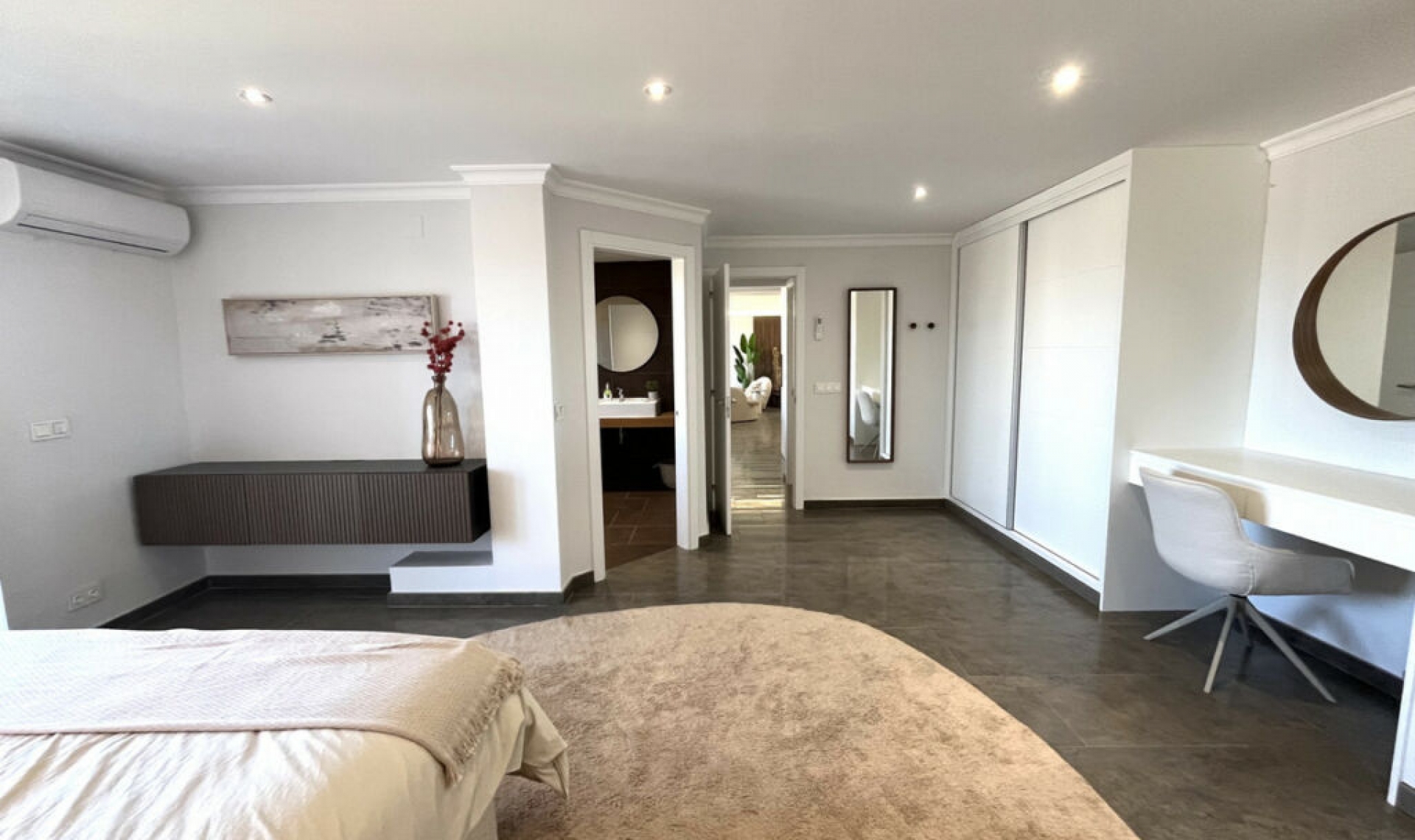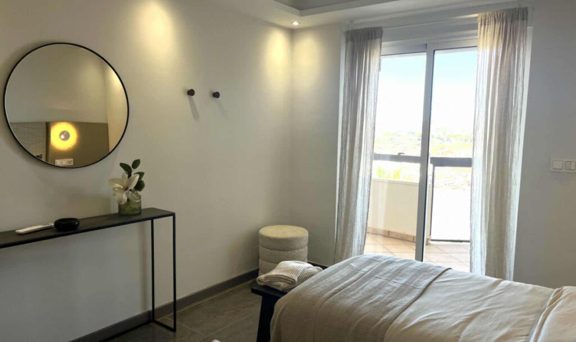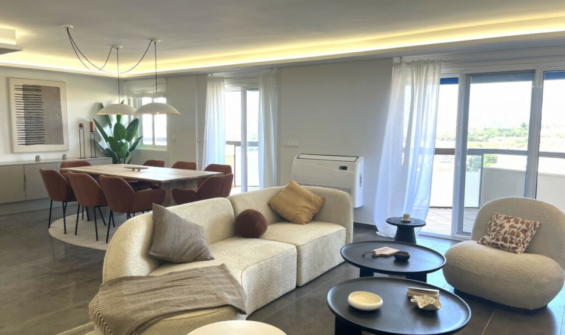 Experience the rare sense of space and openness in this beautifully renovated apartment, created by merging two separate units into one generous and well-designed home. This property offers panoramic views of the Mediterranean Sea and the surrounding mountains, all within 15 minutes' walking distance to the beach and local amenities. Boasting four spacious bedrooms, two elegant bathrooms and one guest toilet, this apartment is ideal for families or anyone seeking both comfort and room to breathe. At the heart of the home is a large open-plan living and dining area seamlessly connected to a modern, fully equipped kitchen. The master bedroom is exceptionally spacious and features its own en-suite bathroom, creating a private retreat within the home. Two of the bedrooms, as well as the living area, offer direct access to the expansive terrace, where you can enjoy breathtaking views that can also be admired from inside the apartment through large windows that flood the space with natural light. The property is situated in a quiet residential complex with a communal swimming pool and shared parking facilities. This is a home where space, style, and location come together in perfect harmony.