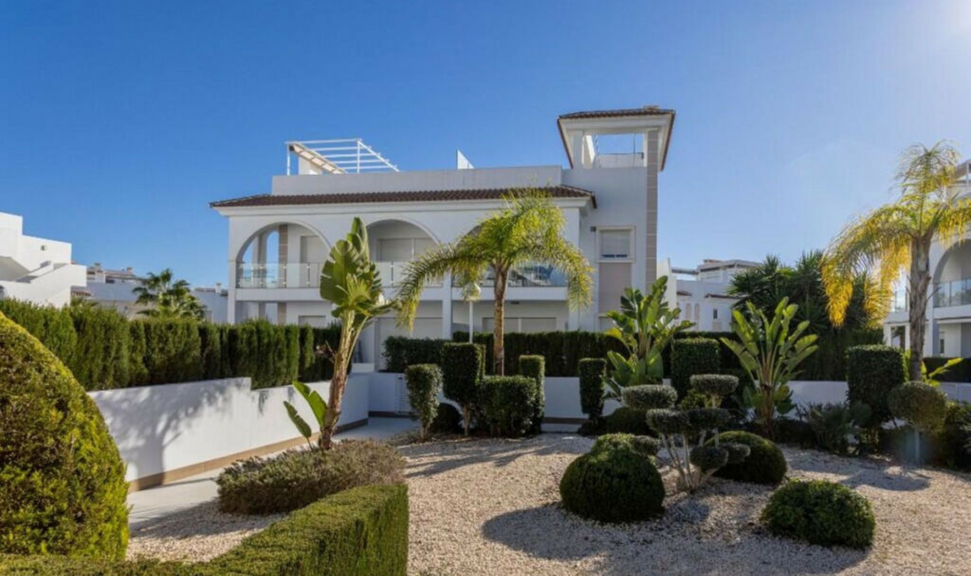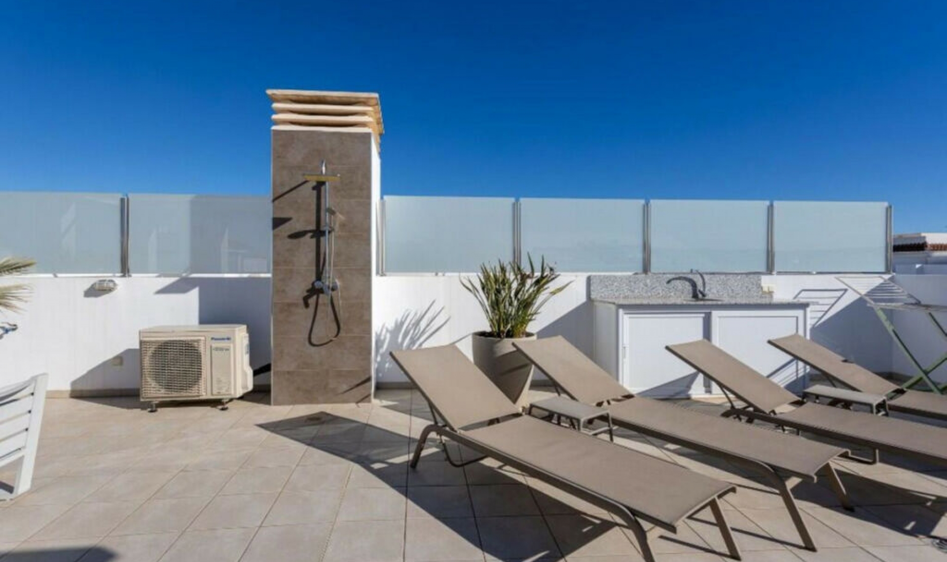 Nestled along the breathtaking Costa Blanca South, in the enchanting town of Rojales/Quesada, Penthouse 'Allegra' promises an exceptional retreat. Just a stone's throw from the seaside resort of Torrevieja and near the charming Guardamar del Segura with its beautiful sandy beaches, this penthouse boasts unparalleled accessibility. With Alicante-Elche Airport conveniently located just 30 minutes, reaching this beautiful destination is a breeze. Penthouse 'Allegra' is meticulously designed with modern interiors and equipped with all contemporary comforts, offering a warm and welcoming atmosphere that will make you feel instantly at home. The property features two spacious, fully furnished bedrooms, two modern bathrooms, and a fully equipped kitchen. The large living room is adorned with very comfortable furniture, and you can enjoy your leisure time on two terraces, including a balcony with a table and four chairs and an exceptionally large rooftop terrace. From here, you can soak in stunning views of the lagoon and the beautifully landscaped garden with three generous communal swimming pools. For those seeking additional amenities, there is a children's playground, fitness facilities, and free tennis courts nearby. The rooftop terrace is particularly impressive, featuring a spacious dining table with six chairs under a retractable awning, a cozy lounge set, sun loungers, a complete outdoor kitchen with a barbecue, refrigerator, and sink, as well as an outdoor shower with both hot and cold water. Moreover, the penthouse offers secure outdoor parking with three electric gates and a private parking space, ensuring peace of mind throughout your stay. Penthouse 'Allegra' truly epitomizes luxury living with its blend of modern comfort, stunning views, and convenient access to the best of Costa Blanca South.