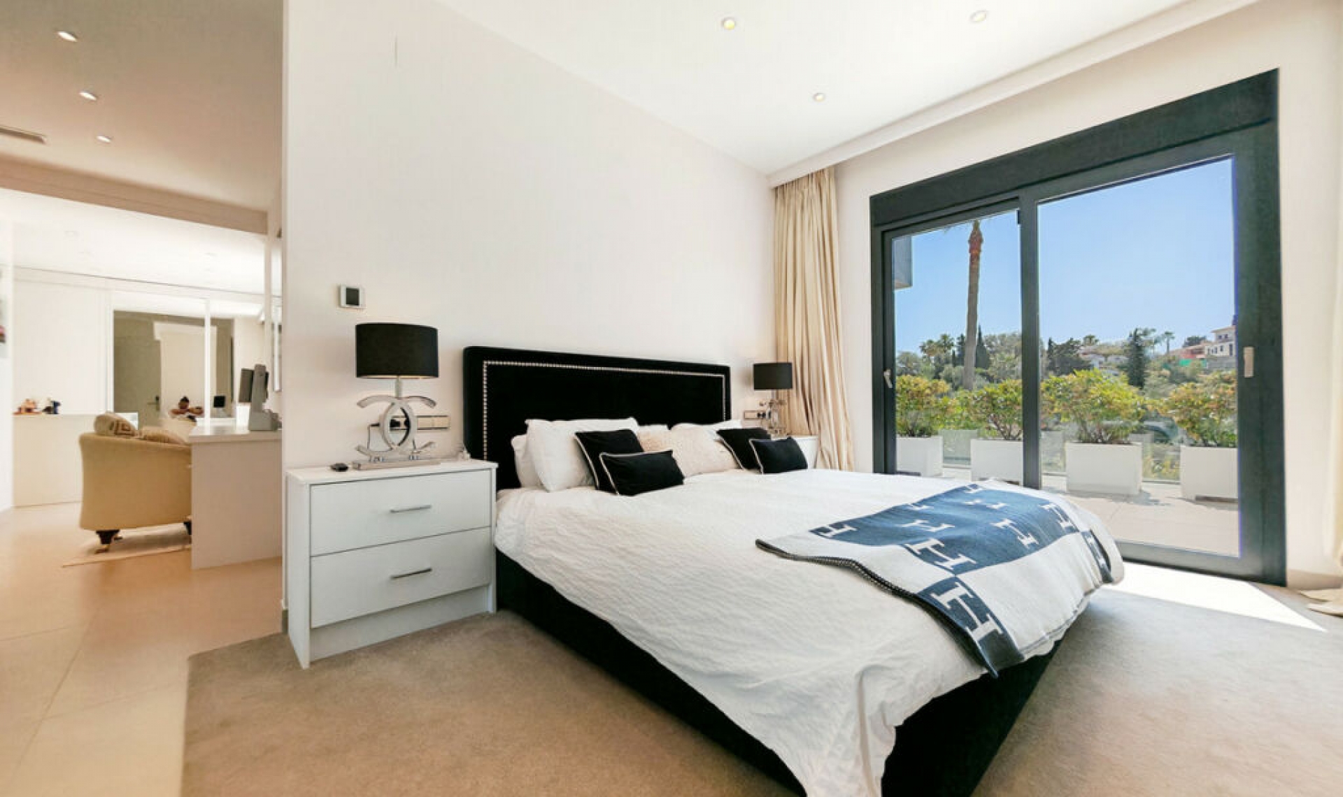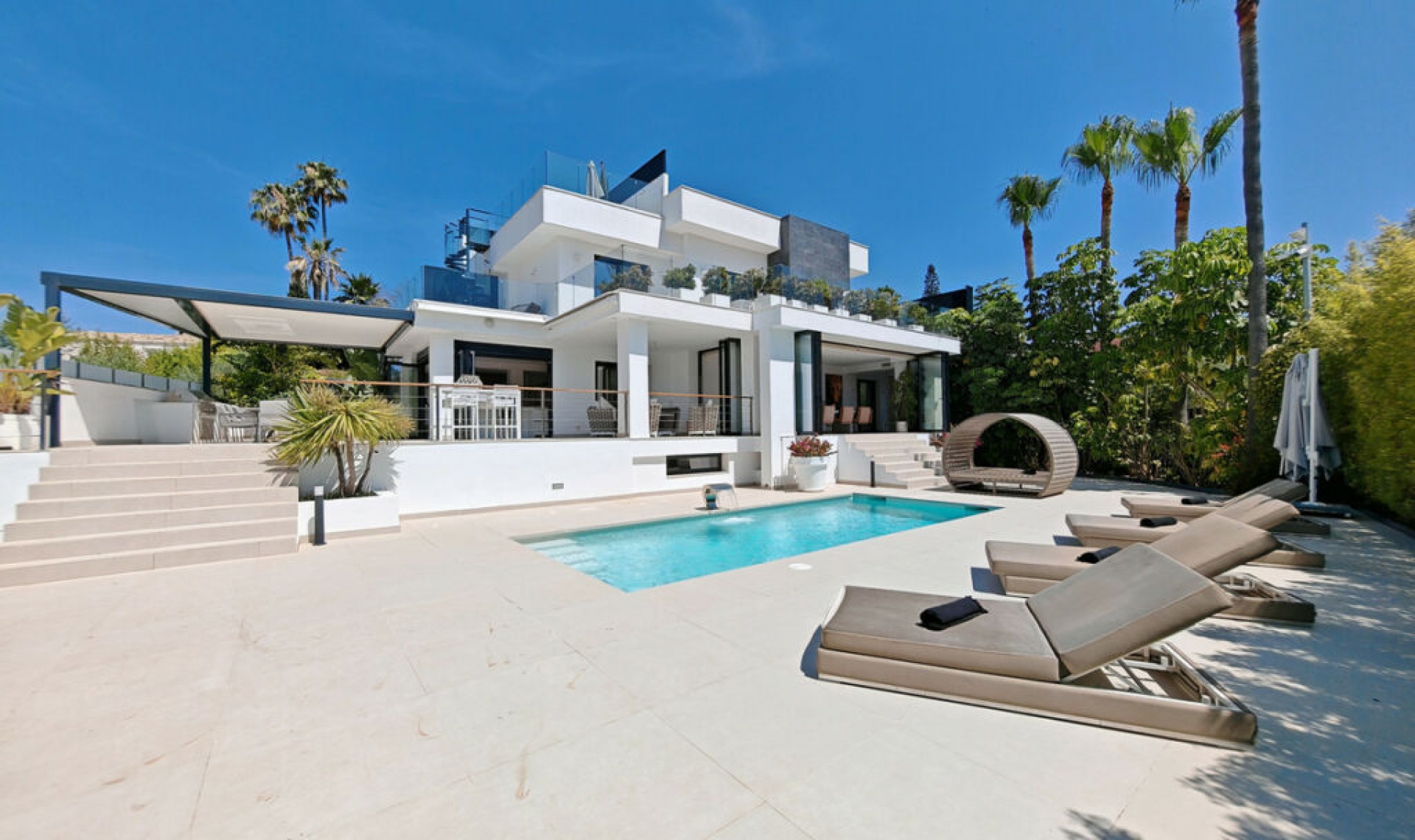 Villa for sale in El Rosario, Marbella with 4 bedrooms, 6 bathrooms and with orientation south/east, with private swimming pool, carport garage (3 parking spaces) and private garden. Regarding property dimensions, it has 737 m² built, 1․436 m² plot and 223 m² terrace. Has the following facilities amenities near, transport near, air conditioning, fully fitted kitchen, satellite tv, basement, gym, alarm, solarium, double glazing, dining room, barbecue, guest toilet, private terrace, living room, sea view, heated pool, underfloor heating (throughout), security shutters, covered terrace, electric blinds, fitted wardrobes, garden view, pool view, cinema room, unfurnished, close to sea / beach, close to golf, uncovered terrace, glass doors, balcony, excellent condition, saltwater swimming pool, close to shops, close to town and close to schools.