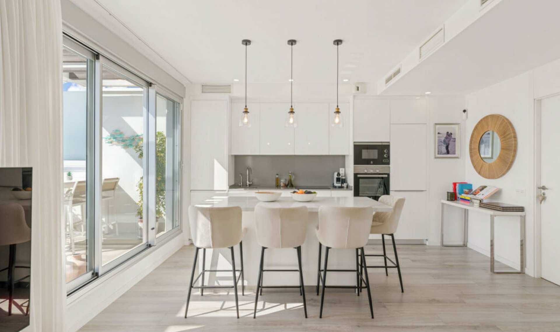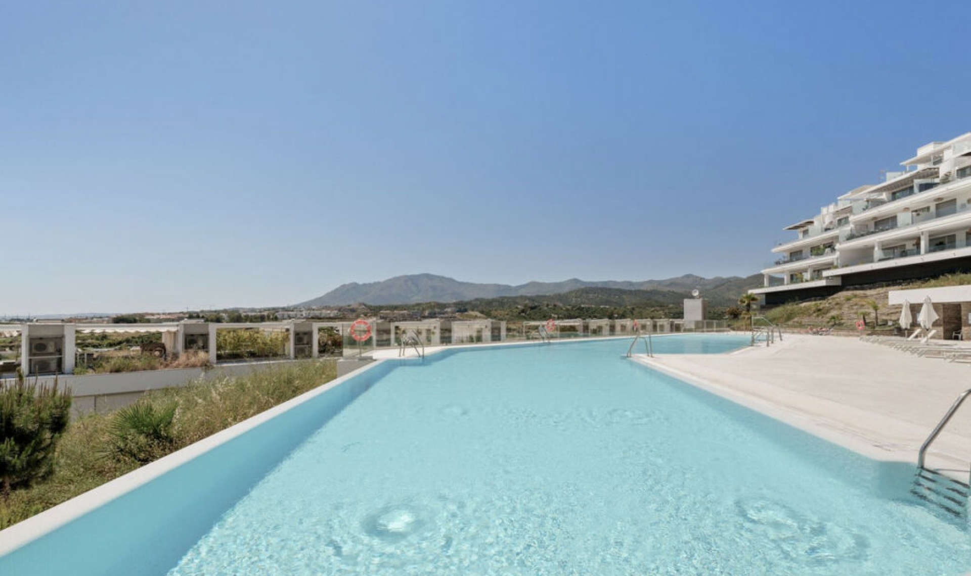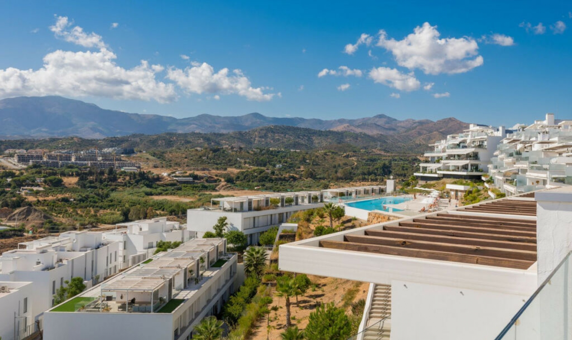 Immaculately presented penthouse apartment boasting panoramic views over the surrounding landscape and towards the Mediterranean. This modern apartment with contemporary interior is situated in a recently constructed gated development with large communal pool, located at walking distance from the the quaint town of Cancelada. The apartment itself is well appointed with an open plan kitchen with breakfast bar and living area, all of which access the terrace with dining and lounge areas. On the backside of the apartment is a guest bedroom, a guest bathroom as well as the masterbedroom with en-suite bathroom. From the main terrace, a spiral staircase gives access to the spacious solarium with stunning vistas, perfect for lounging and sunbathing. The property comes with an underground parking space as well as a storage room. Residents also have access to the Club House across the road which offers a well equipped gym, spa and restaurant.