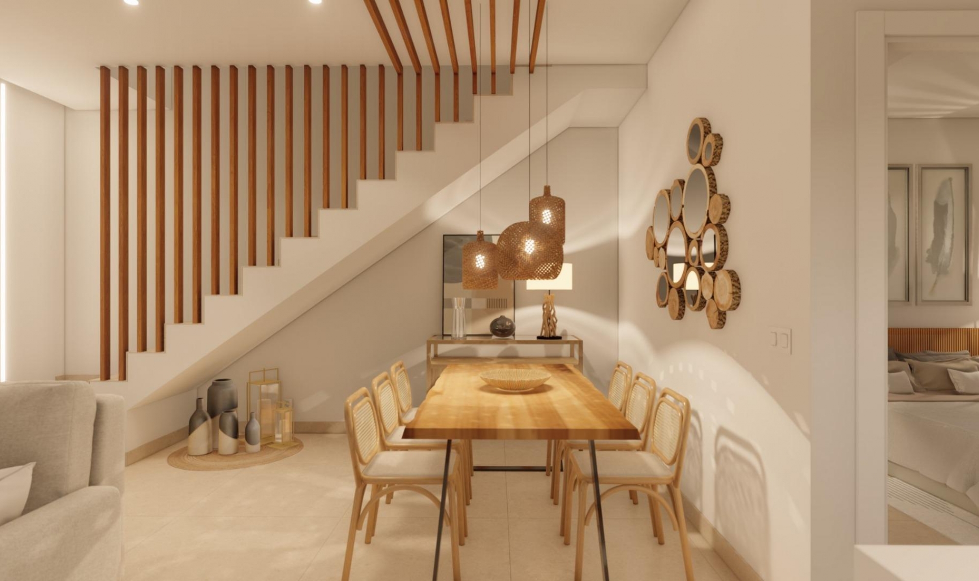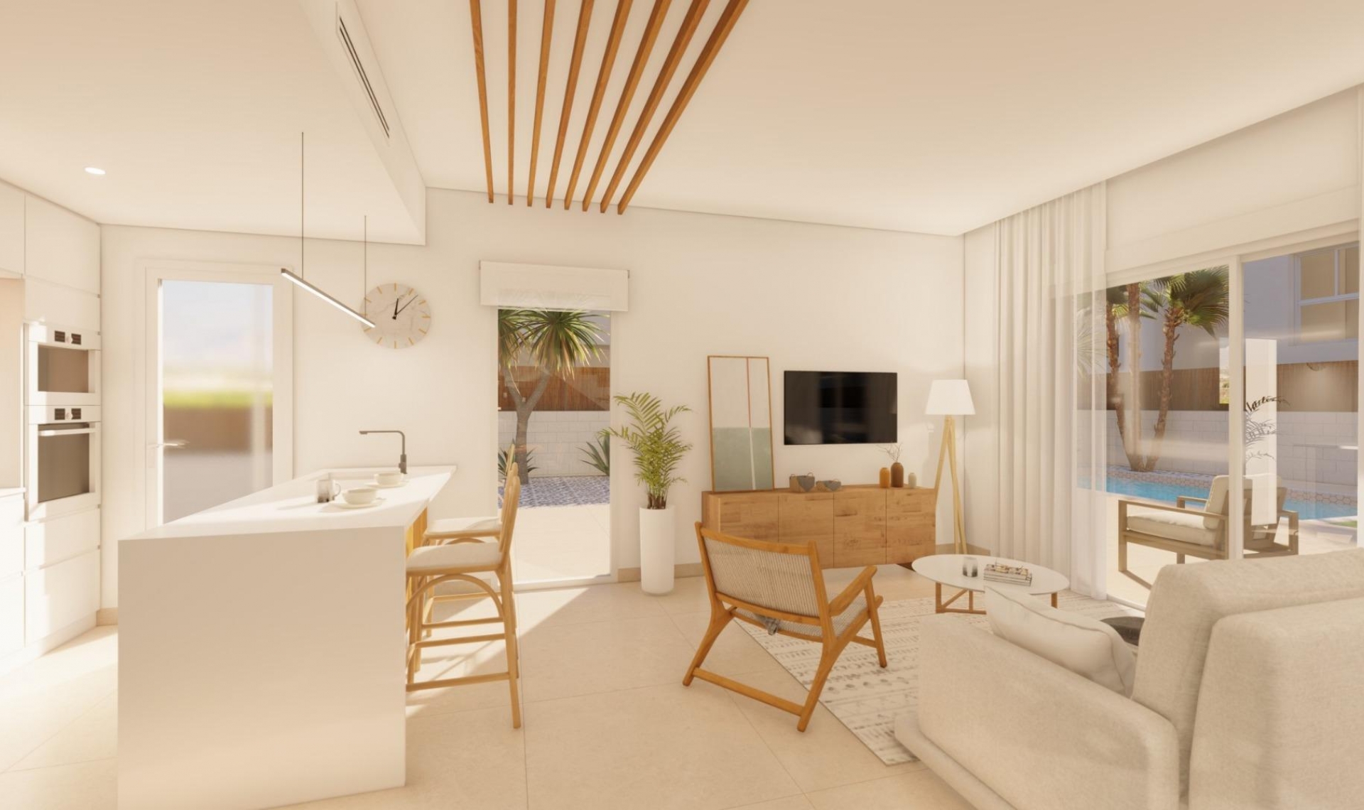 NEW BUILD VILLAS IN PILAR DE LA HORADADA New Build villas in Pilar de la Horadada. The interior of the villas consist of 3 bedrooms, 3 bathrooms en suite, large open plan living room with kitchen all located on two floors. The exteriors have a large landscaped garden with private swimming pool and parking space. New Build Villas where you will find the best Mediterranean style adapted to modern design. Residential consists of 17 villas located in Pilar de la Horadada, surrounded by all the services you need and just a few minutes from the beach. Pilar de la Horadada is a typical Spanish village in the most southern part of the Costa Blanca. The large main street has supermarkets, lots of shops, restaurants and bars and some lovely squares. The beautiful beaches of Torre de la Horadada and Mil Palmeras with fine sand promenade is just 5 minutes away. In Pilar de la Horadada there is also a well-developed cycling and walking path network, and there is also a large offer of various sports activities. Lo Romero 18 hole golf course is just a short drive from town. The airports of Corvera (Murcia) and Alicante are respectively 40 and 55 minutes away.