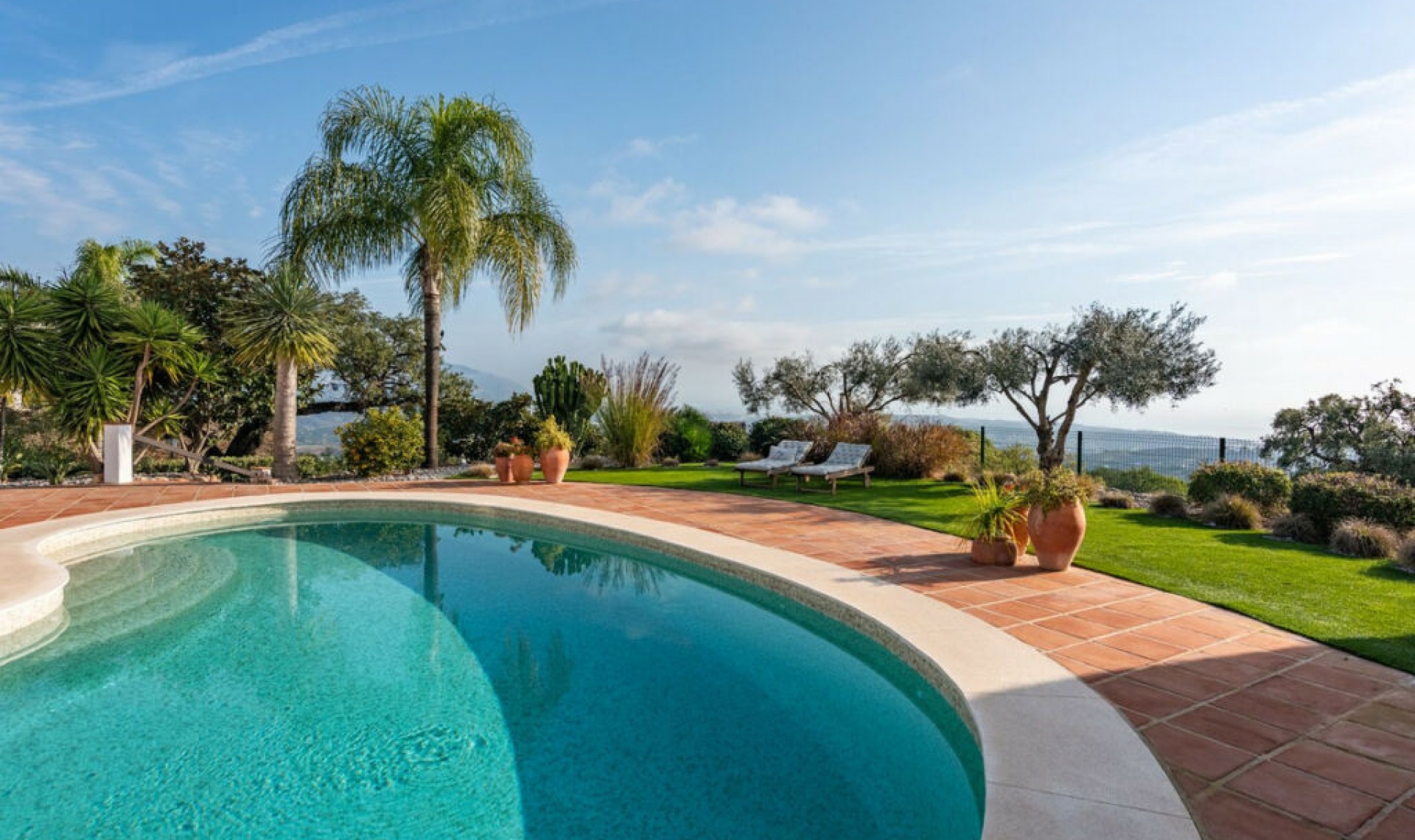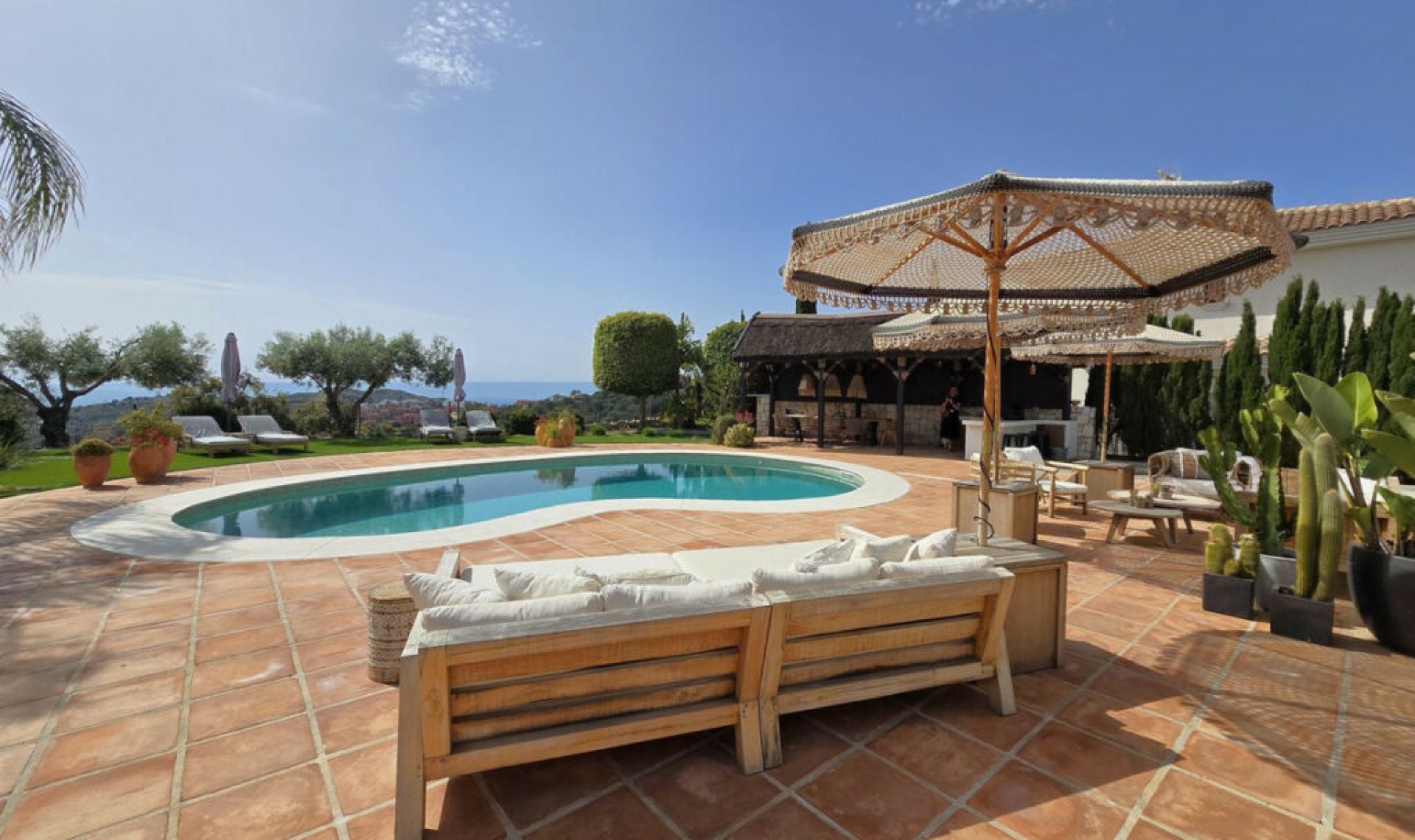 This stunning family villa was designed by renowned Spanish architect and built with the highest quality materials, seamlessly blending traditional Spanish elements with modern standards. Recently renovated to the highest specifications, the villa exudes vintage charm while offering elegant, contemporary design that reflects the distinctive style of Southern Spain. Located in La Mairena, near Elviria, the villa is set on top of the slope ridge offering unparalleled 360º views of the sea, surrounding mountains, and the picturesque Valley of La Mairena, stretching down to La Cala Golf Resort. The property offers complete privacy, breathtaking views, and an awe-inspiring pool area, making it the perfect retreat. The villa spans two levels, plus a large basement and an attic with potential for an additional bedroom or office space. Upon entering through an elegant conservatory patio, you are welcomed by an impressive solid oak wood Arabic-style door. The spacious and cozy living room with a fireplace flows into a large dining area, while the brand-new, fully equipped luxury kitchen opens onto a charming courtyard, perfect for breakfast. Adjacent to the kitchen is a large laundry and storage room. The rear terrace offers breathtaking panorama to the mountains and lush country side. On this level, you will find two generous bedrooms, each with an en-suite bathroom of which the superb master suite with walk-in dressing area, bedroom with vaulted ceiling and luxury bathroom with Italian shower and designer bath. On the upper level, two large bedrooms share a bathroom and access a really large terrace overlooking the UNESCO-protected nature reserve park, park where to enjoy the most beautiful sunsets. The basement level accessible via inner staircase and also separate entrance, accommodates a comfortable second sitting room of almost 50m2, and can be used as home cinema, office, fitness room, game room or guest/staff accommodation. The villa's outdoor areas are equally impressive, featuring a beautiful heated swimming pool, a tropical gazebo perfect for al fresco dining, and outstanding sea views. Additionally, there is a pétanque court and a variety of fruit trees, complemented by a beautifully landscaped stone garden with olive and cork oak trees. Located just a ten-minute drive from Elviria's shopping center, the villa is close to some of Marbella's best sandy beaches, top restaurants, and supermarkets. La Mairena is an exclusive, tree-lined urbanization that offers a peaceful and tranquil environment, where the sounds of birdsong and the hum of bees provide a natural soundtrack. The cool mountain air offers respite from the heat, making this the perfect location for luxury living in the most idyllic natural surroundings on the Costa del Sol. Bedrooms: 4+1 | Bathrooms: 3 | Built: 380 m2 | Terrace: 70 m2 | Plot: 2․160 m2 | Pool: 47 m2 | Garage & parking for 3-4 cars| Orientation: S Airport: 30 min drive - Marbella: 14 min drive - Puerto Banús: 19 min drive - Golf course: 3 min drive - Beach: 10 min drive - Closest Bars&restaurants: 2 min drive - Amenities: 9 min drive - Public Transports: 9 min drive Our team works incessantly to make sure that the description and the sales prices for the properties offered on this website are correct and up to date. Notwithstanding, the information contained in this website is subject to errors and omissions, and the properties themselves subject to price changes, prior sale or withdrawal from market. The property market on the Costa del Sol very dynamic and the good properties are being snapped up fast! We suggest that if you see something you like that fits your budget, contact us as soon as possible to avoid disappointment!
