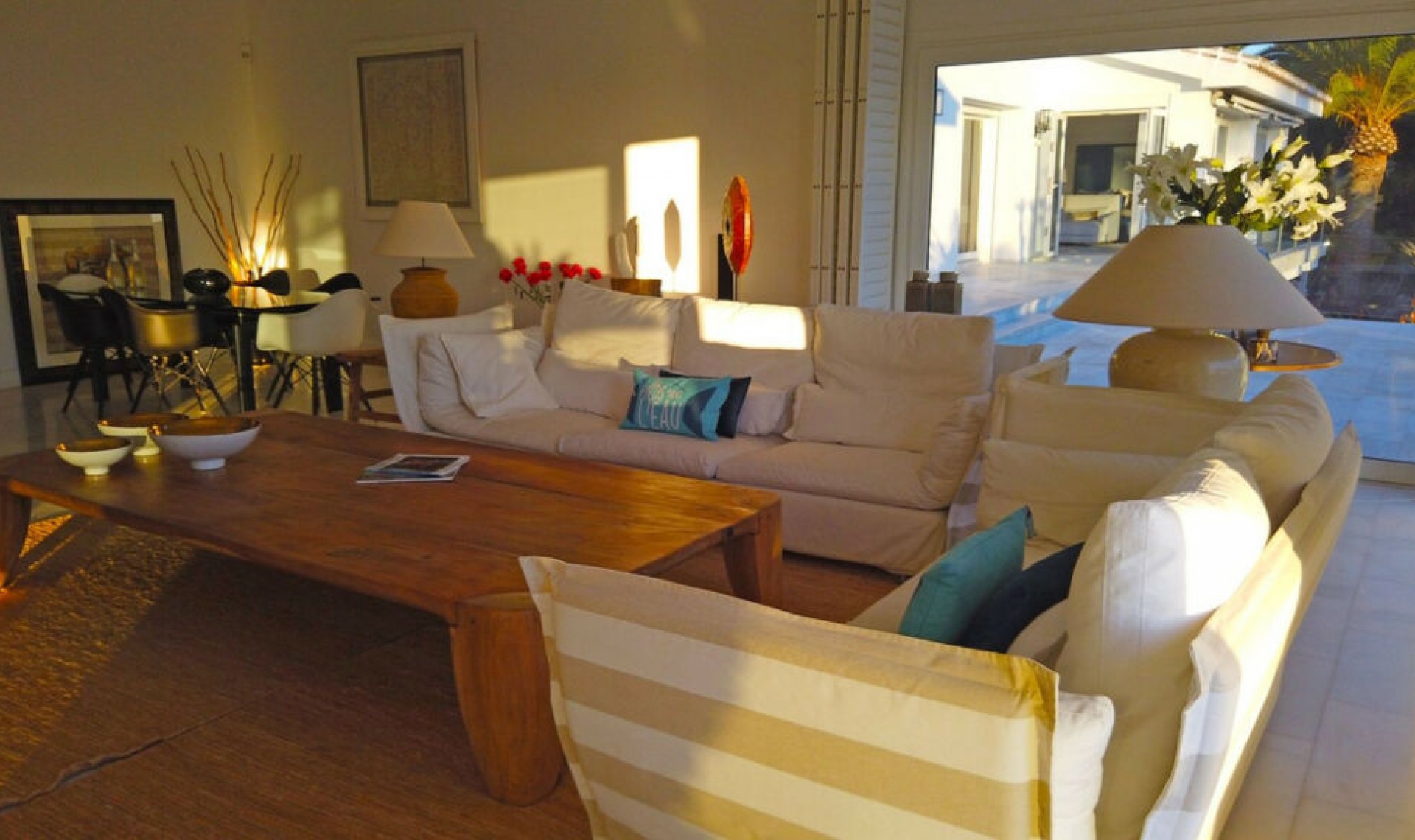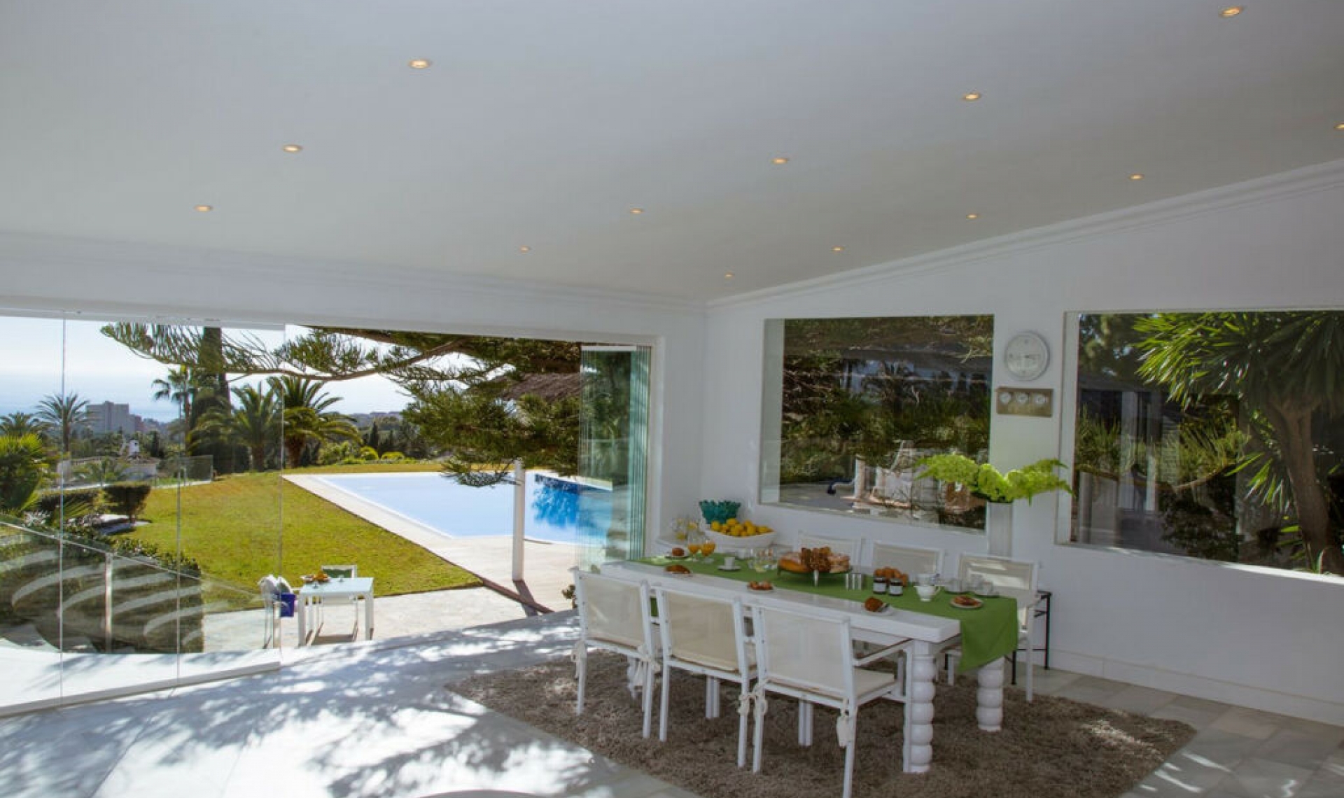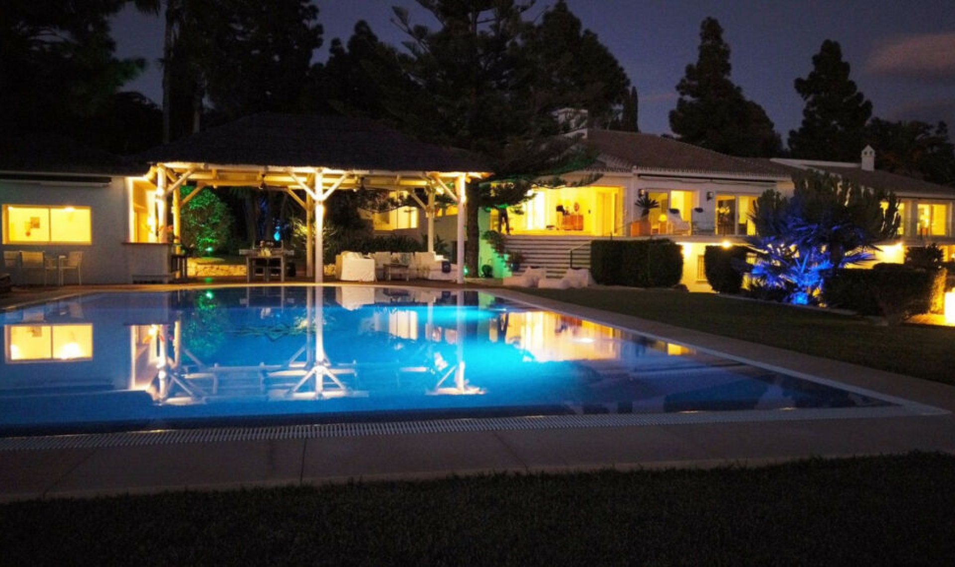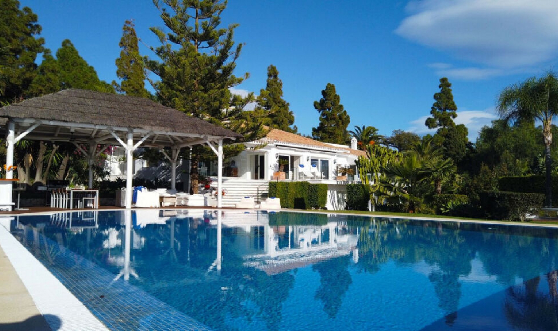REDUCED 999․000․00 to motivate sale... Luxury villa set in beautiful tropical gardens with amazing sea views from everywhere. One of east Marbella finest villa, this 7 bedroom 9 bathroom luxury villa has everything you could want, large bright airy rooms all with great views of the gardens then out to sea, beautiful established tropical gardens with a fantastic pool and poolside area. The 12 meter by 7 meter heated, salt water pool is enhanced with a very large bali style bar/kitchen and seating area, sauna and large jacuzzi all with outstanding sea views, a great area for entertaining. The villa has an Ibiza style to it, very big comfortable rooms flowing into each other, all the bedrooms are well thought out with great light and views with the master bedroom taking your breath away, large glass doors leading out to an amazing rap around terrace. The villa is in the middle of one of the best resorts in Marbella, Hacienda Las Chapas with its 24 hour guards, manicured street and great communal areas. Even though this beautiful villa is central to the whole resort, no part of the villa or gardens is overlooked.