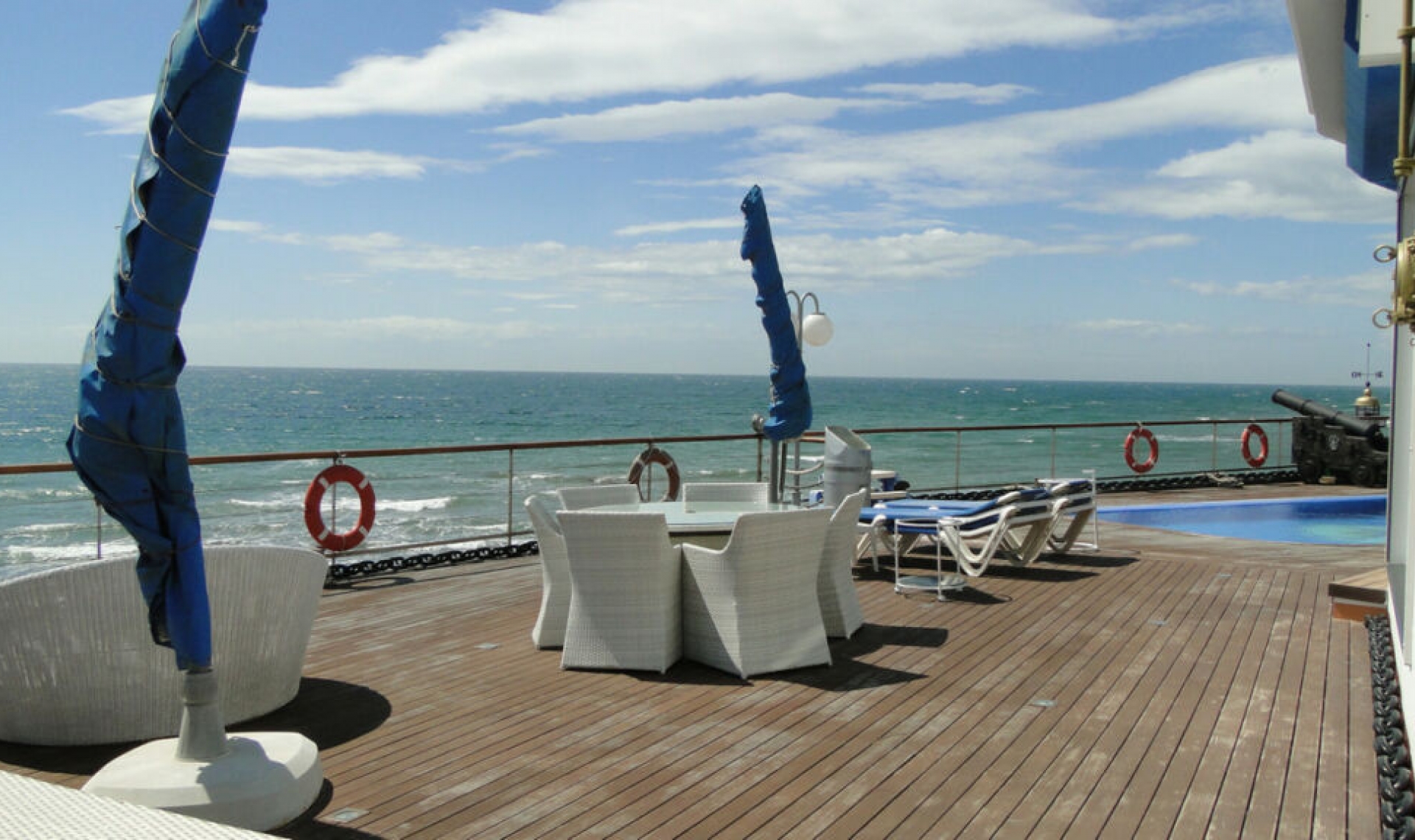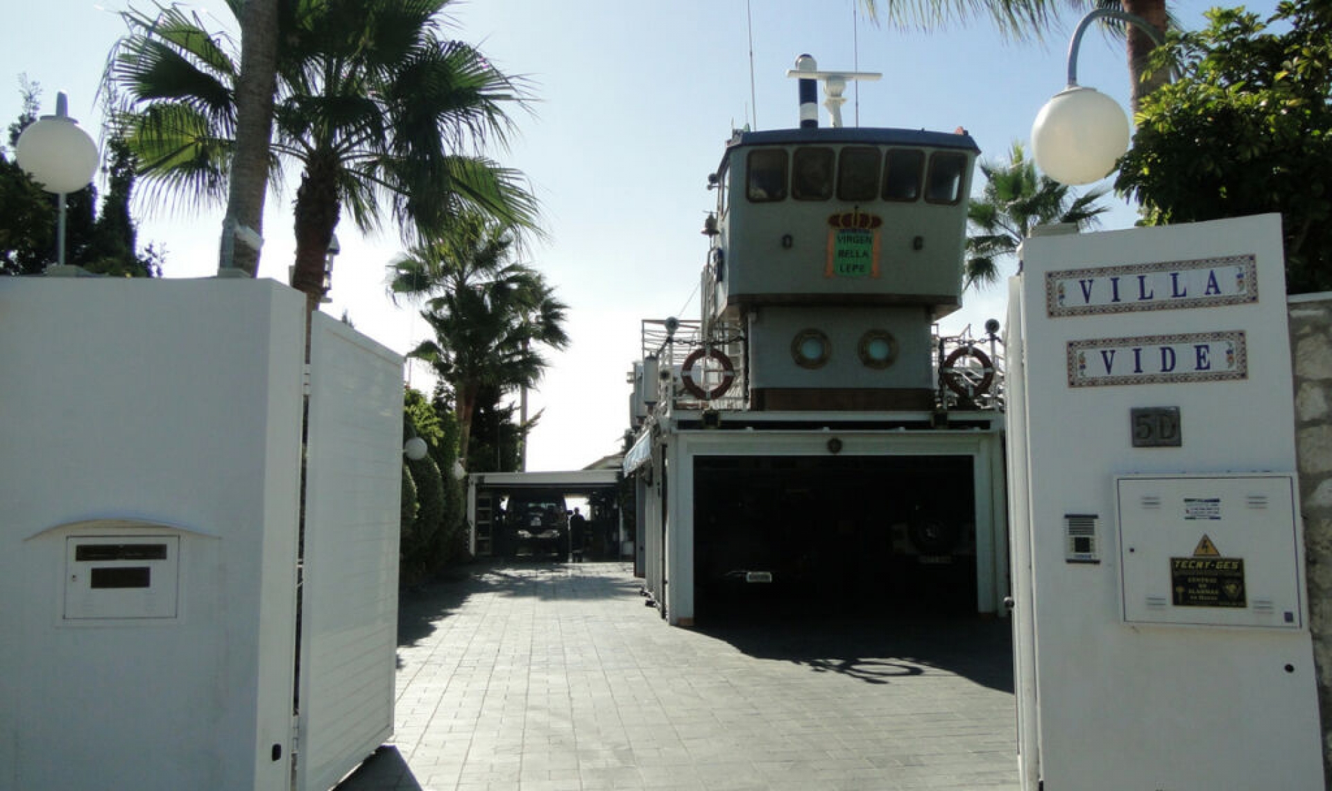 AN IMPRESSIVE, UNIQUE AND ORIGINAL VILLA WHICH IS TOTALLY FRONT-LINE BEACH IN EL CHAPARRAL WITH PRIVATE DIRECT ACCESS TO THE BEACH. IT HAS BEEN DESIGNED TO REPLICATE A BOAT WITH THE RESULTING SENSATION THAT YOU ARE LITERALLY NAVIGATING THE OCEAN FROM ANY TERRACE OR WHEN LOOKING OUT TO SEA. IT CONSISTS OF 6 BEDROOMS EACH WITH ITS OWN EN-SUITE BATHROOM AND INDIVIDUAL DECOR. THE MASTER SUITE IS ON THE SECOND FLOOR AND HAS A HUGE PRIVATE TERRACE. SOME OF THE MANY FEATURES ARE: HEATED POOL, UNDER FLOOR HEATING, CENTRALISED AIR CONDITIONING, FIREPLACE, HIGH QUALITY KITCHEN, BRAZILIAN MARBLE FLOORING, PARKING FOR AT LEAST 12 CARS, GARAGE AND WORKSHOP. THE GUEST APARTMENT IS ACTUALLY A REAL BOAT WITH TWO BEDS, SMALL KITCHEN AND BATHROOM. SOMETHING TRULY ORIGINAL. EVERY DETAIL OF THE HOUSE HAS BEEN CAREFULLY CHOSEN TO REFLECT AND REMIND YOU OF THE MARINE WORLD. THERE IS NO OTHER VILLA LIKE THIS ON THE COSTA DEL SOL FOR IT´S INDIVIDUALITY AND AMAZING SENSE OF STYLE!