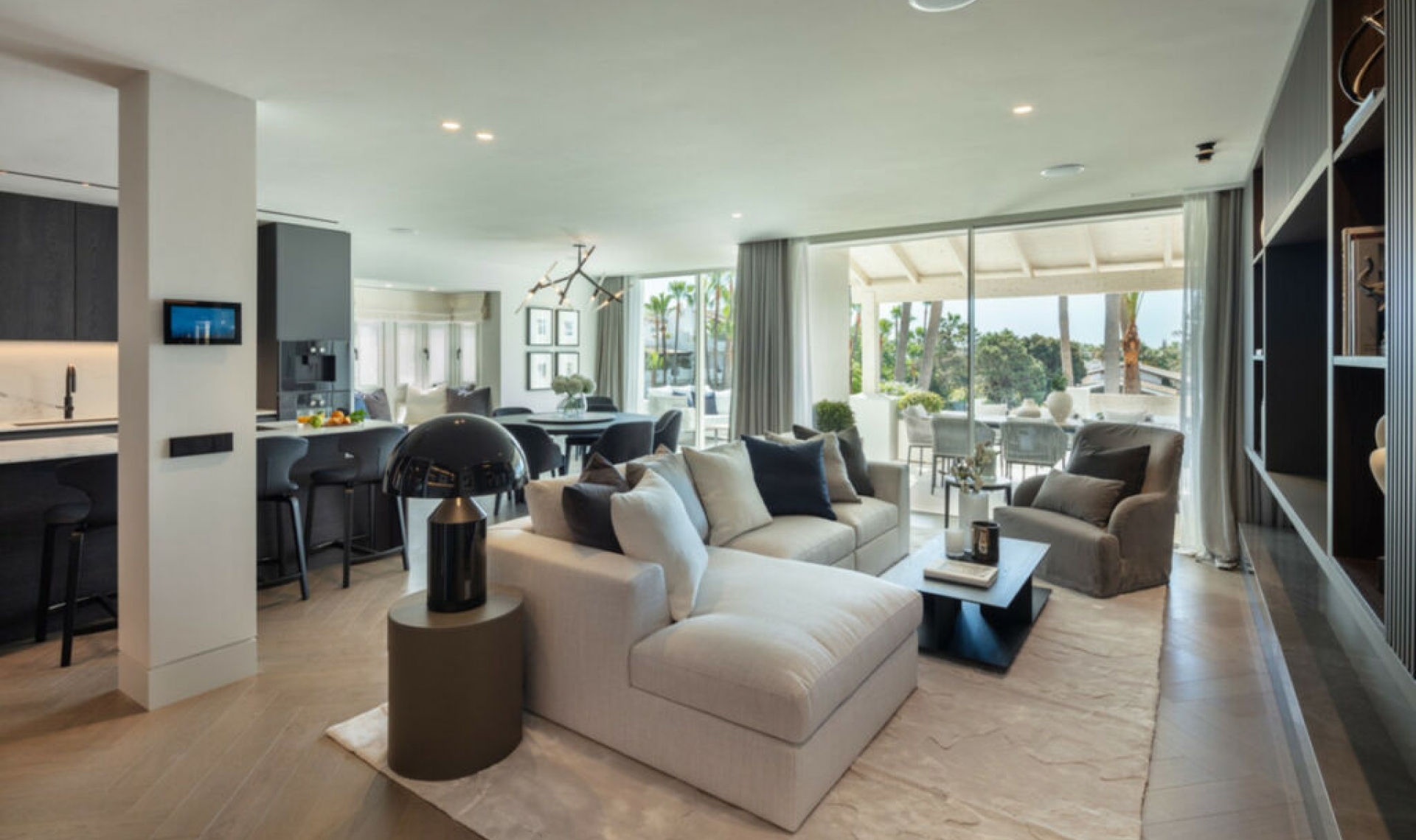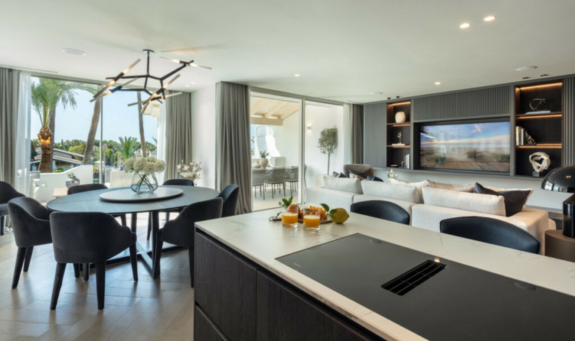 This stunning duplex penthouse is located in the prestigious Marina de Puente Romano, situated in the sought-after Marbella Golden Mile area of Marbella, Malaga. With its prime beachfront location, this property offers breathtaking views of the sea and the surrounding area. The duplex penthouse boasts 3 spacious bedrooms and 3 bathrooms, providing ample space for comfortable living. The ground floor features a stylish living area, a fully fitted kitchen, and a dining area, perfect for entertaining guests. Additionally, there is a guest toilet for convenience, and also 1 guest bedroom with en-suite bathroom. Taking the flight of stairs up to the first floor, you will find two bedrooms, each with its own private terrace. The master suite is a true oasis, complete with a dressing area and an en-suite bathroom with a walk-in shower. From the first floor, you can enjoy panoramic views of the sea and the beautiful surroundings. This luxury penthouse offers a range of desirable features, including air conditioning, marble floors, and double glazing. The property is fully furnished and has a fireplace, creating a cozy and inviting atmosphere. The underfloor heating throughout ensures comfort all year round. The penthouse is part of a gated community with 24-hour security service, providing peace of mind for residents. The communal areas include a stunning garden and a communal pool, perfect for relaxation and enjoying the Mediterranean climate. With its prime location, this property is close to all amenities, including shops, restaurants, and transport links. The beach is just a stone's throw away, allowing residents to enjoy the sun, sand, and sea. The property also benefits from being close to a children's playground and the vibrant port of Marbella.