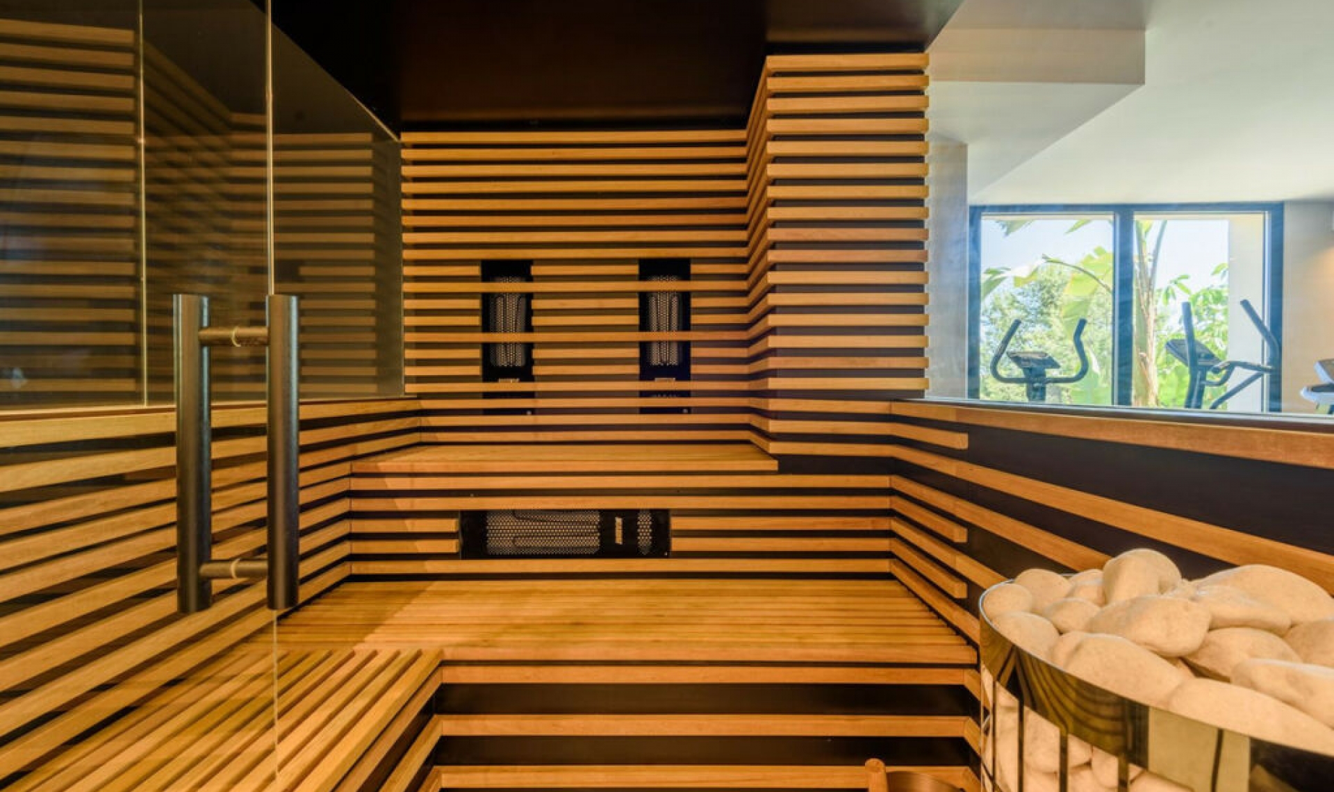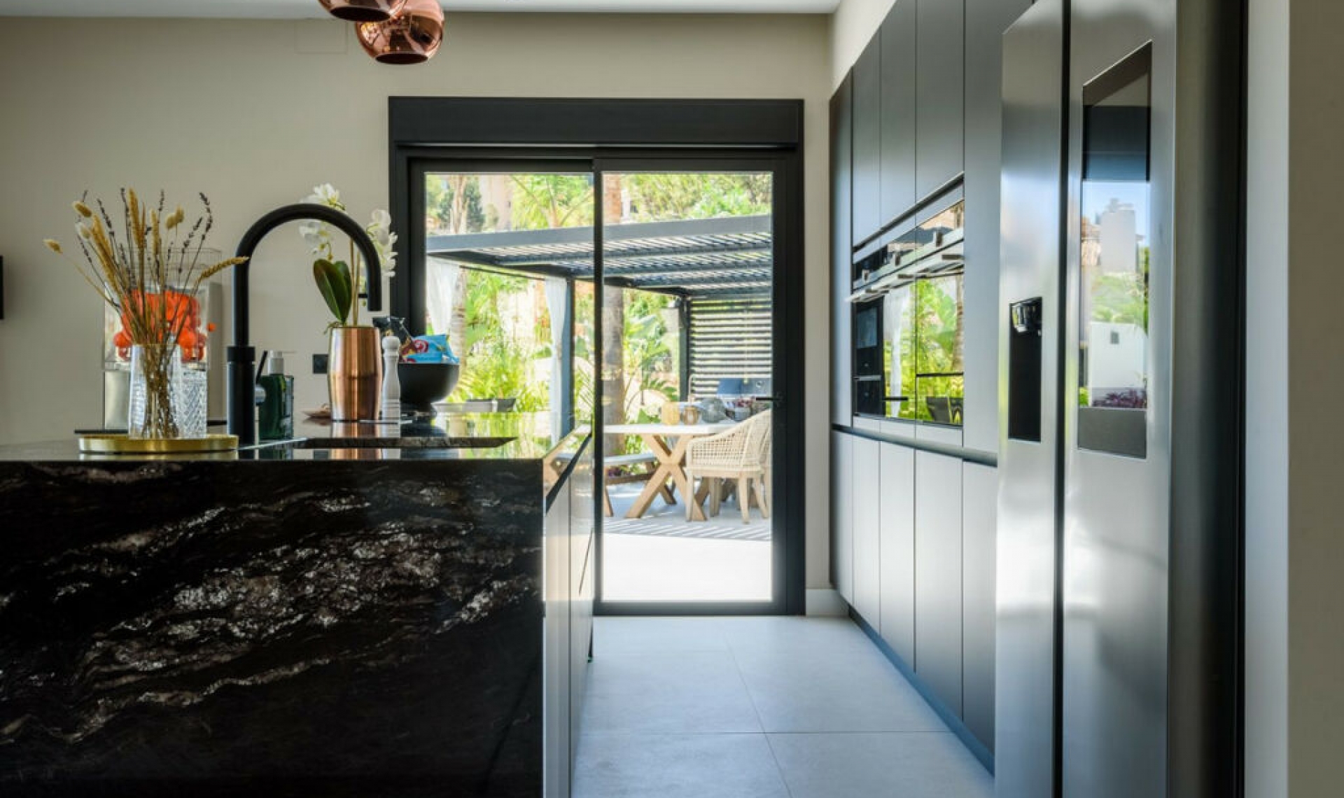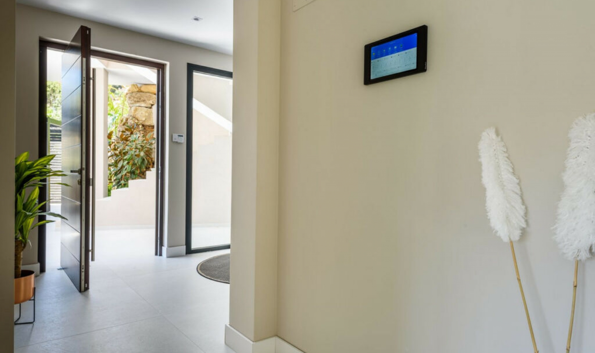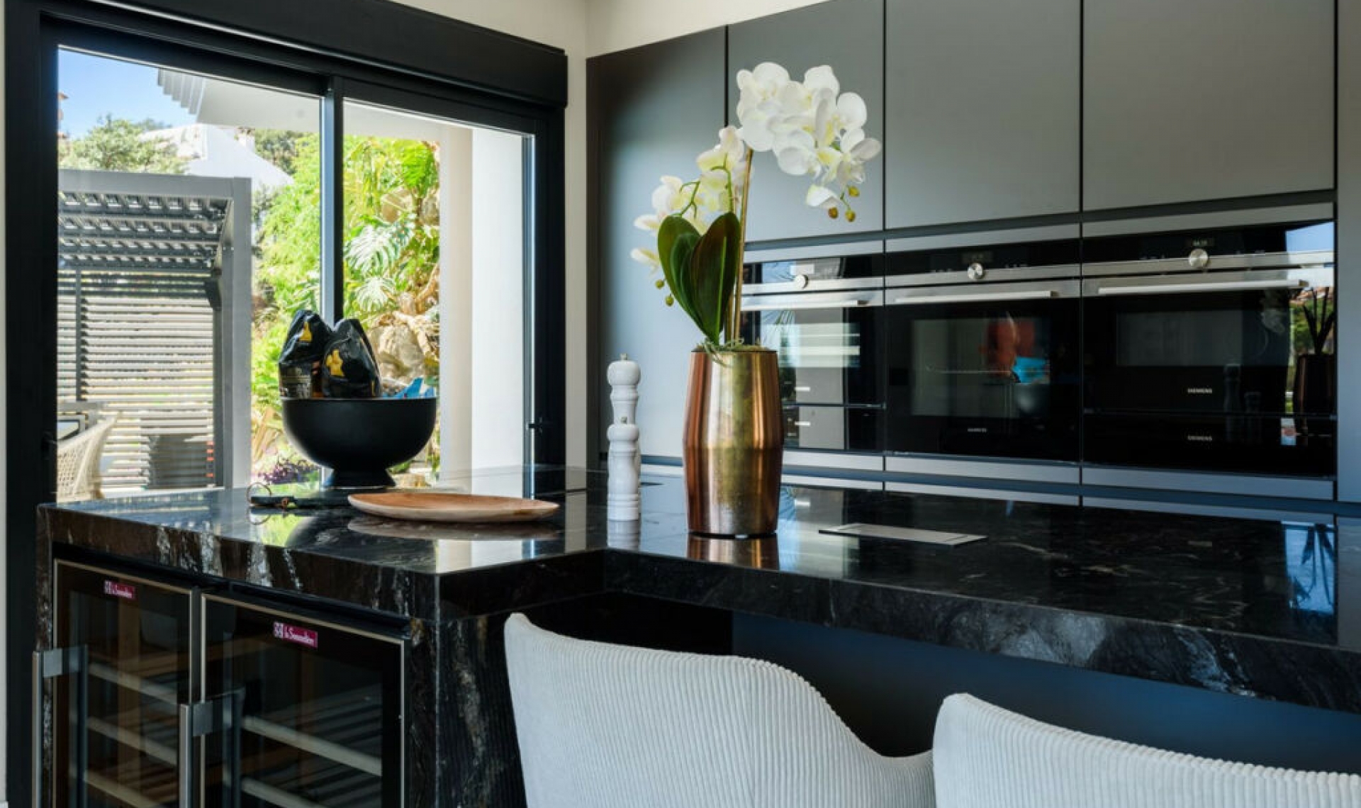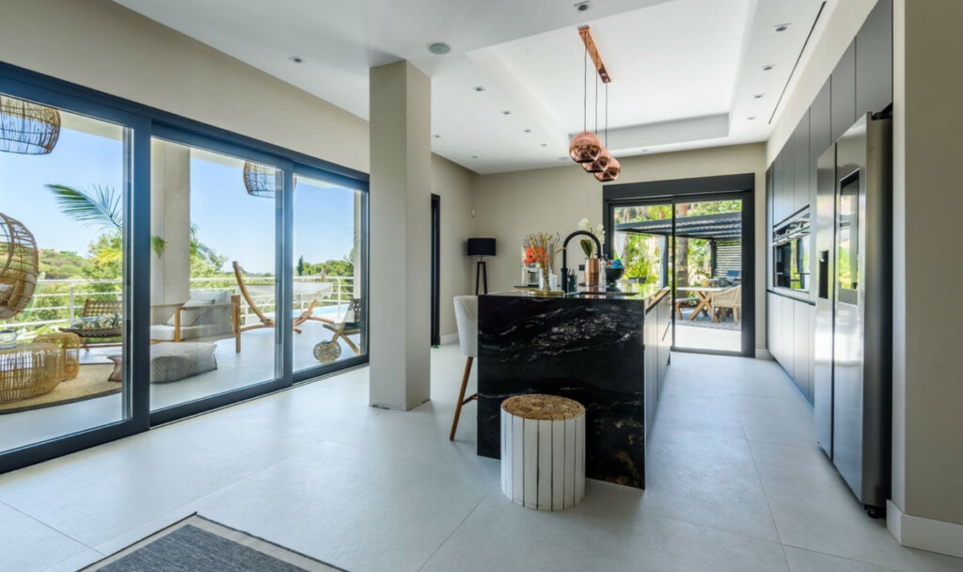 This unique luxury, very modern high-tech villa yet embracing Andalusian charm, is located first line golf to the Santa Maria Golf course offering breathtaking sea views. This very spacious property, situated on a large plot of 1335m2, is fully renovated to the highest standards. It offers seven bedrooms, seven bathrooms and a guest toilet; a home cinema, gym and spa. Due to its hillside location, the villa is divided over five floors which are all accessible via the indoor elevator. The driveway has a carport with solar panels, with enough space for two cars. On the street level, the garage for another two cars is located with an electric car charger, as well as one of the main entrances to the house. On this floor the storeroom and laundry room are located. The outdoor area offers an infinity pool, outdoor kitchen and lounge areas. It has been fully renovated, equipped with the latest technology and is energy efficient.