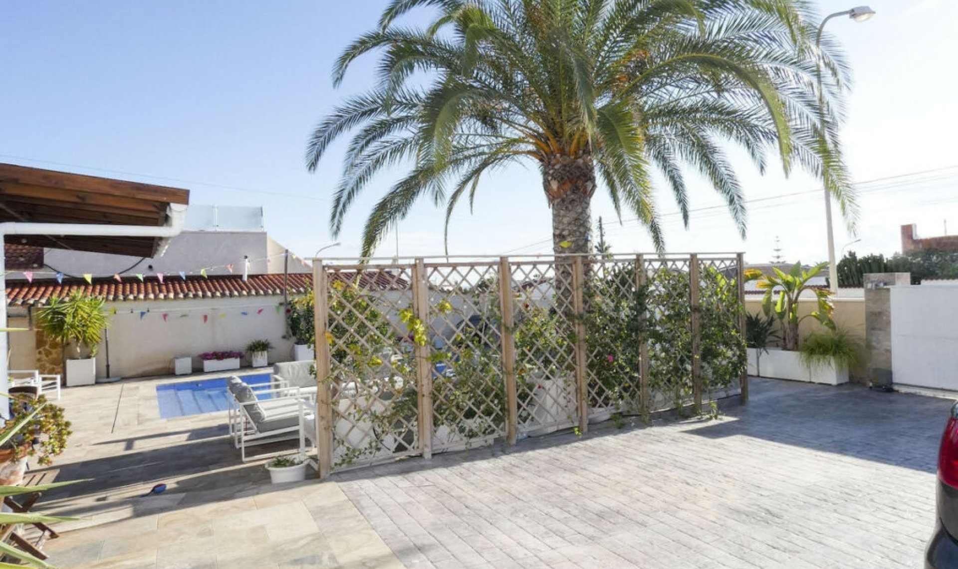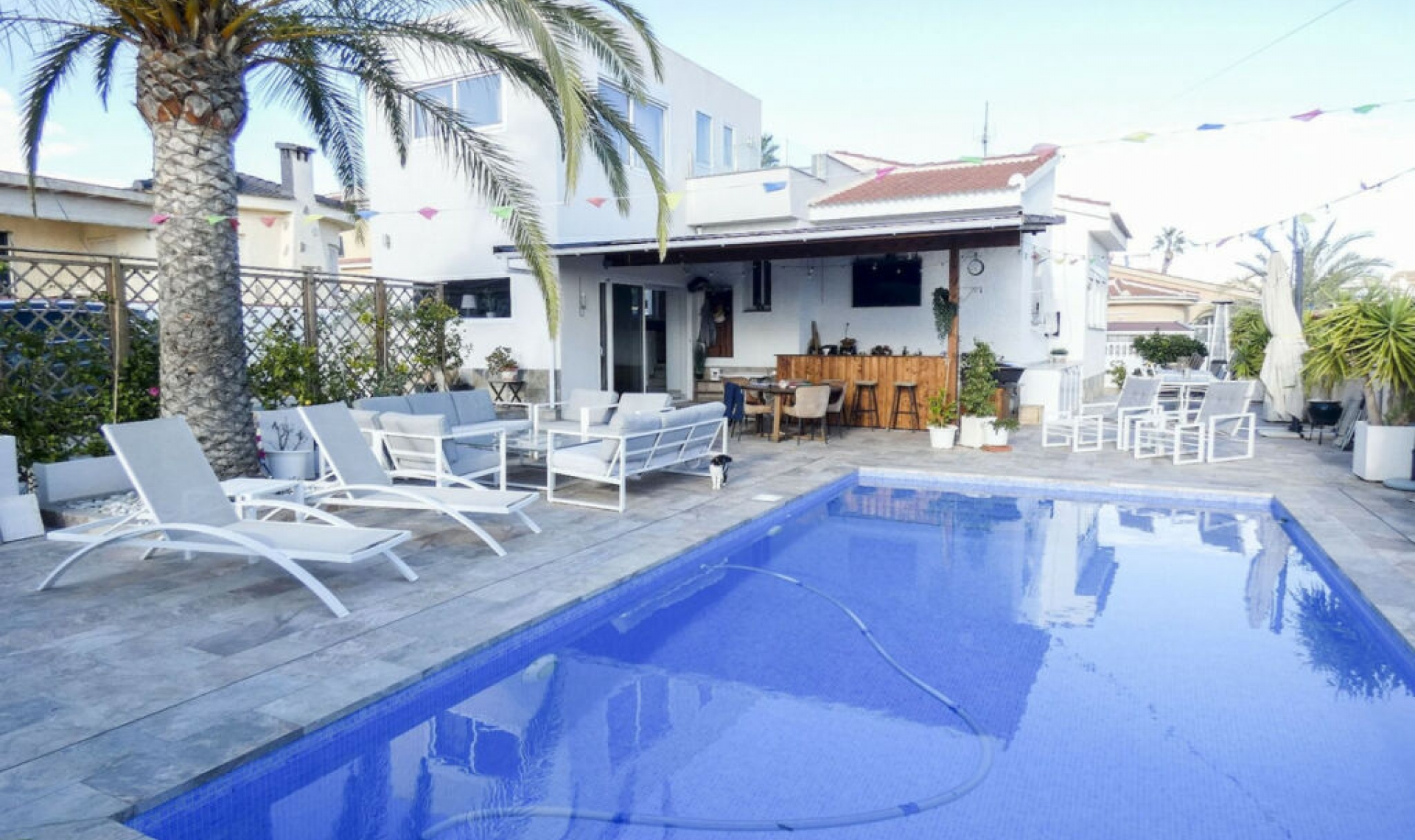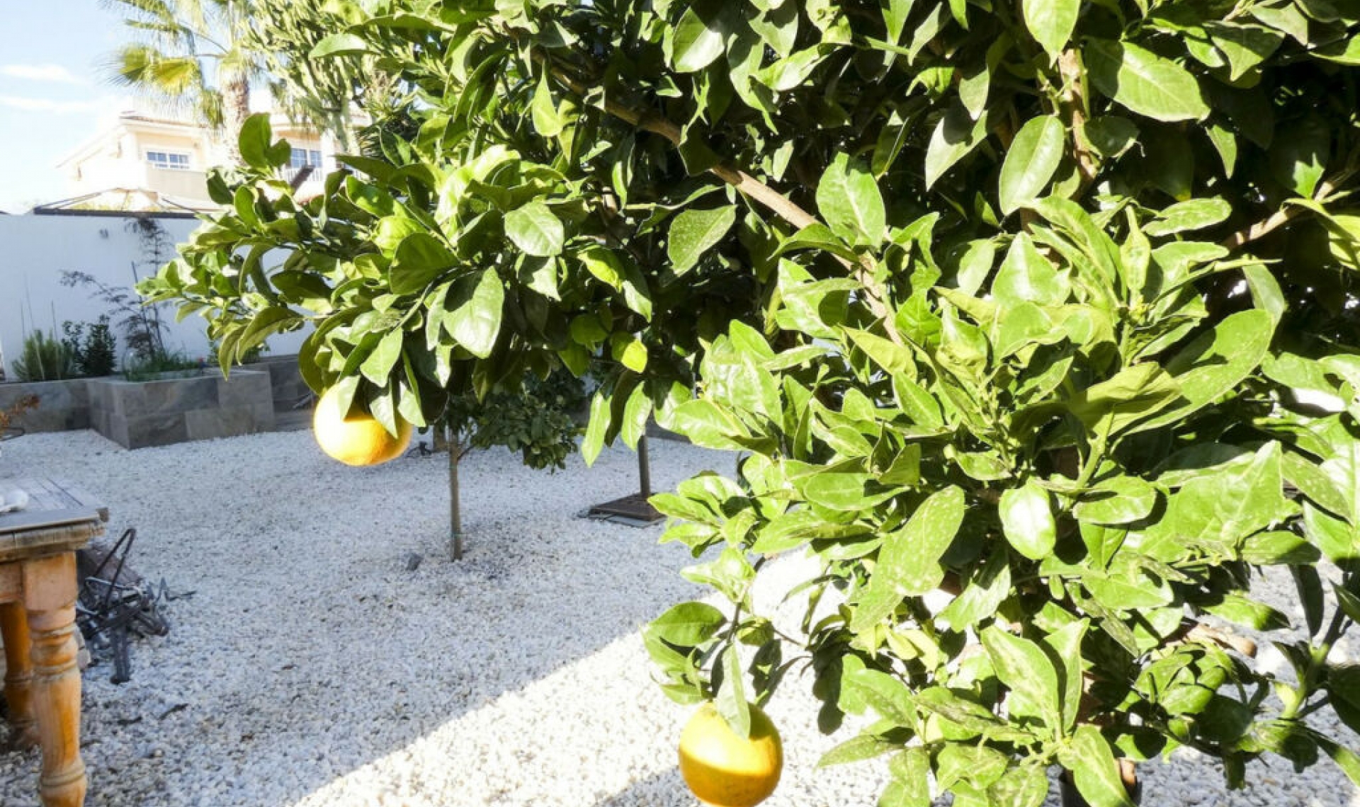 Do you want a villa with everything extra? Then you have found your home here! A large plot with a thoughtful layout. Here, plants and flowers thrive alongside mandarins, oranges, kiwis, limes, passion fruits, and mangos. There are planting boxes for vegetables and herbs at the back, along with two storage sheds. A large saltwater pool leads you to an outdoor kitchen (with refrigerator/freezer and dishwasher) and bar, as well as spacious areas for dining furniture, a lounge section, and sun loungers. The house also opens up with a spacious and modern kitchen, a TV room, a large bathroom with a shower, and four bedrooms, including a master bedroom with a walk-in closet and an ensuite bathroom with a shower. There is underfloor heating in the ensuite bathroom and the kitchen. Upstairs, you will find an additional apartment with a large bedroom, a bathroom with a shower, and a balcony with a fantastic view of both the salt lakes and the sea. Integrated air conditioning and two separate AC units in one of the bedrooms (currently an office) and in the apartment on the upper floor. There is parking for two cars on the property with an automatic gate. Automated irrigation for pots and trees. Within walking distance, there are restaurants, bars, shopping, a gym, and a very good new bodega, as well as Marquesa Golf Course two kilometers from the house. Welcome home!