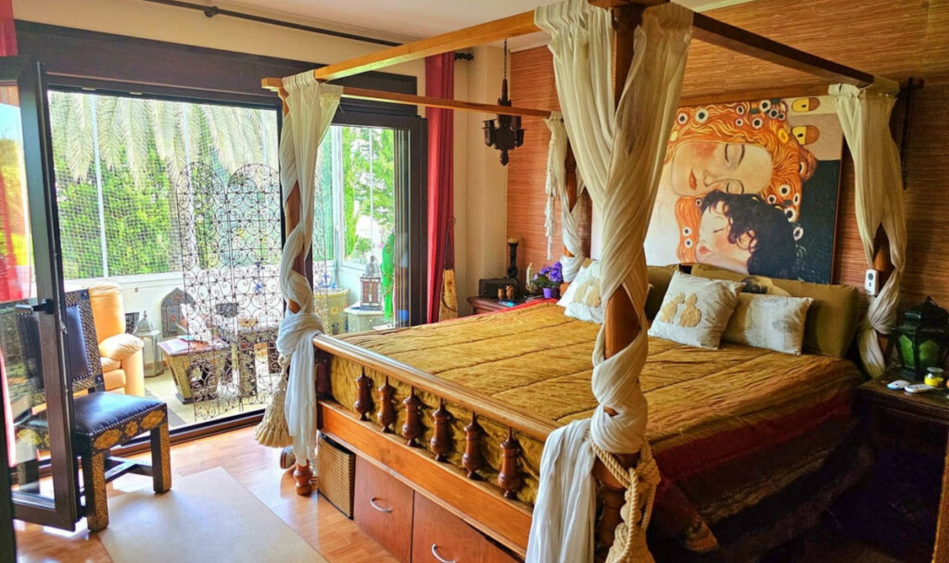 This duplex is inside a beachfront complex and one of the first houses near the beach with sea views from the upper terrace. At the entry you are in a big yard with barbacue, eating area and a lot of free uncoverd space for chill out area or anything you like.crossing the yard you enter a spacious living room with an open kitchen, all very rustical style and there is another doble bed in a separate area next to the living room towards the yard with a curtain for the division and there is one bathroom. Going up the stairs to level 2 you will find a main bedroom and another smaller bedroom both with direct access to the luminous terrace with the sea views, you have views to the garden and pool and to the sea from there, just magnificant. The comunity pools , 1 big one smaller for children have sea views as well. Also there is a tennis court in the comunity garden area and the parking is inside the urbanisacion on the outdoor parking area. You are just next to the Area of Seghers in Estepona and could walk to the port of Estepona on the promenade in 25 minutes, wirh the car it is 3 min. drive into Estepona port. On the way to the port to come along the famous Playa Cristo Beach , where the family with kids are so happy as tge bay has very low water level fin the whole bay.