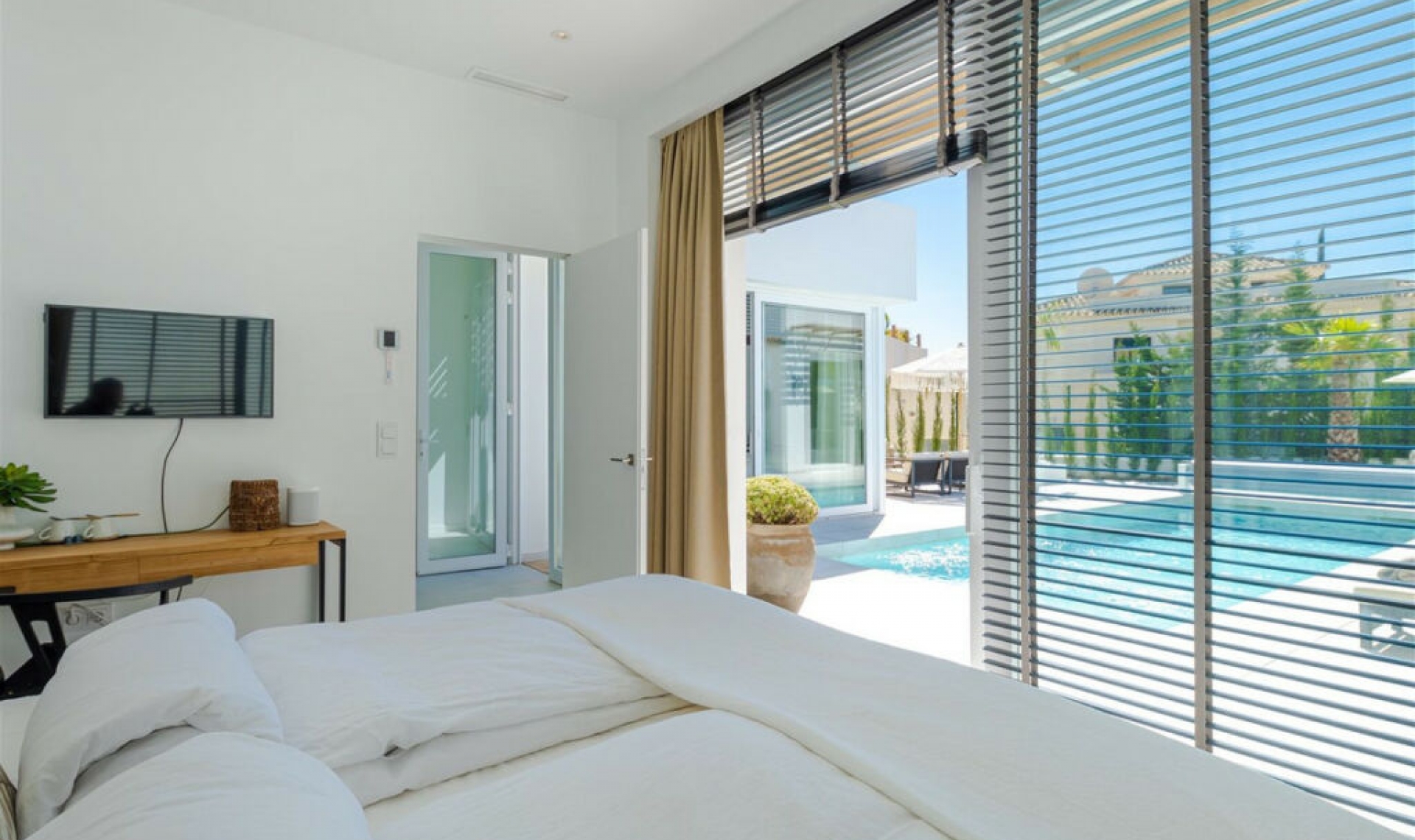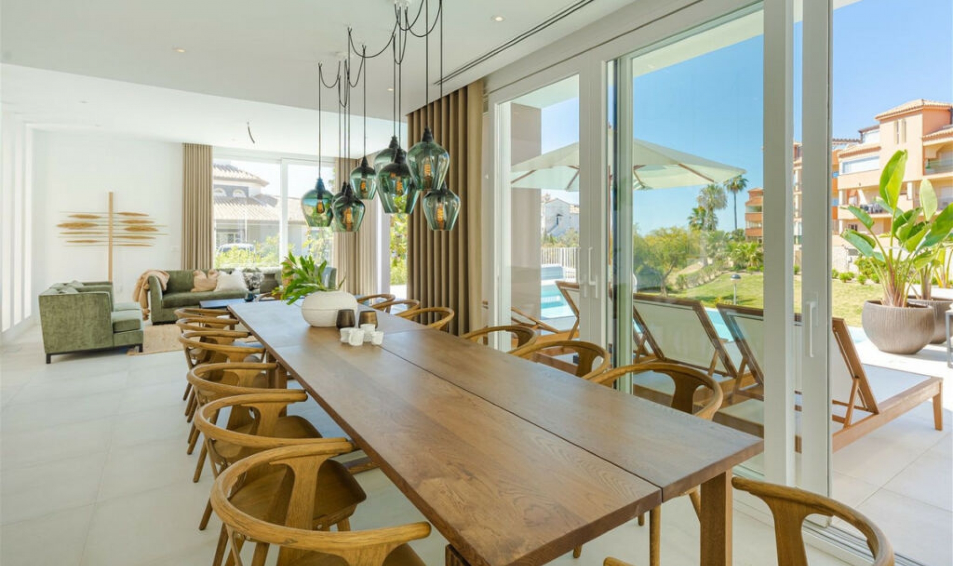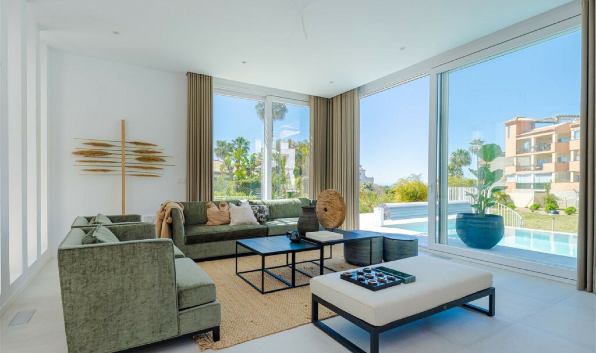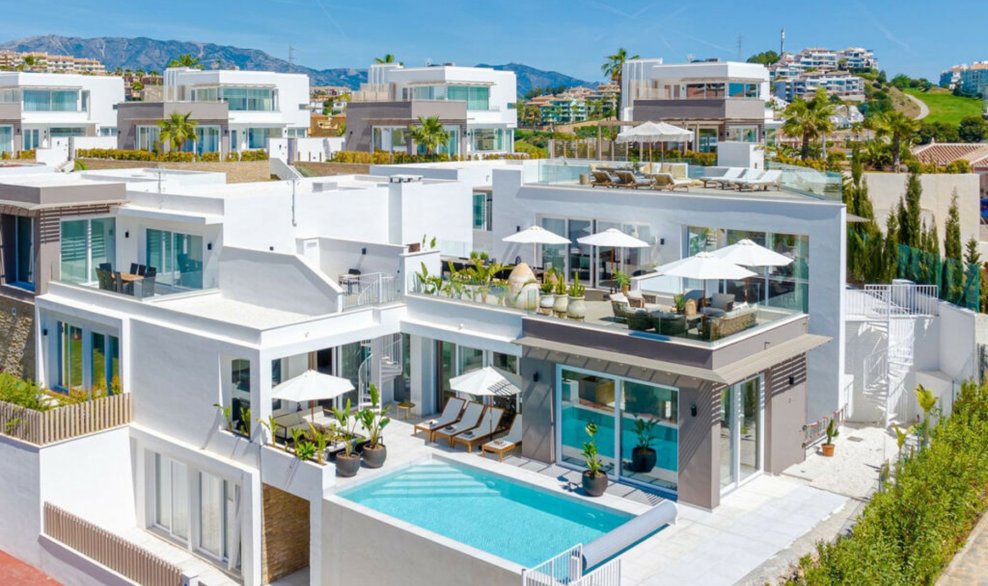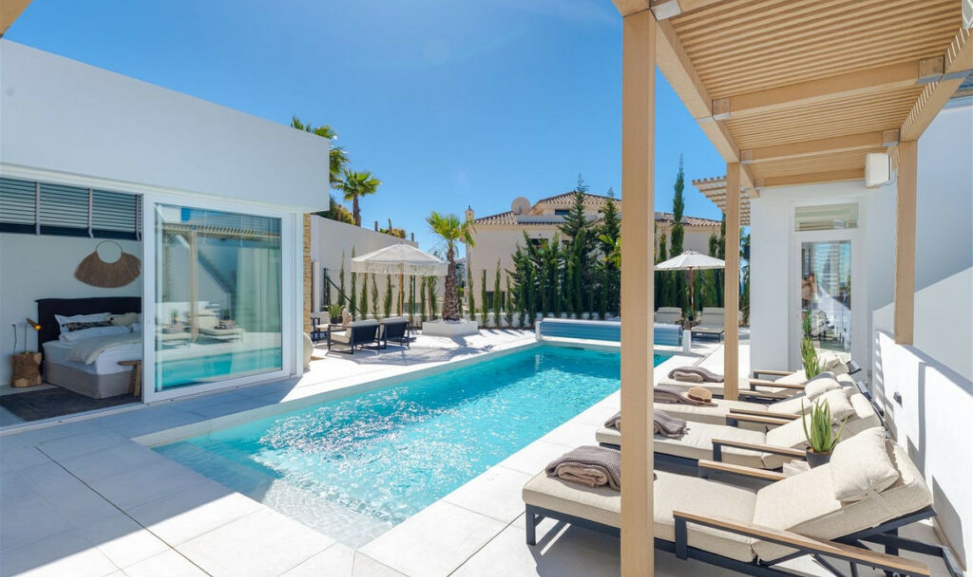 9 BEDROOM SOUTH-WEST FACING LUXURIOUS VILLAS WITH 2 HEATED SWIMMING POOLS, CINEMA ROOM, GYM AND WINE BODEGA CLOSE TO THE BEACH. This unique contemporary 9-bedroom property consists of TWO SEPARATE UNITS which are adjacent to each other on two adjoining plots. The properties could easily be joined together by installation of a lift or staircase if desired. Situated in a luxury, secure gated community, just 1․2 km (a 15 minute walk) from the beach, shops and restaurants in Riviera del Sol and Calahonda. This new development of 12 low-rise villas has been constructed in a contemporary style using very high-end materials. With a combined build size of 476 m2 these two properties consist of two lounges, two fully-equipped open-plan modern kitchens, two guest bathrooms and two large laundry rooms. All nine bedrooms (three in one property and six in the other) have ample fitted wardrobe space and ensuite bathrooms with underfloor heating. Nine of the bathrooms have walk-in showers, sink, and toilet and 1 bathroom has bathtub and shower. Most of the bedrooms have a semi-private outdoor space and are also equipped with a flat-screen TV. The owner has recently installed a gym with state-of-the-art equipment, a comfortable home cinema and a wine bodega with temperature control system. There is a Sonos home sound system providing excellent quality sound both inside and outside of the properties. High ceilings and large heat-resistant windows make the properties feel very spacious and bright allowing for the seamless integration of indoor and outdoor living spaces. Along with the two 8 x 4 metre heated saltwater swimming pools (with counter-current and electric cover) are a generous 89 m2 of terrace/porch areas and 2 huge roof solariums of 76 m2 and 141 m2 with glass balustrade and impressive 360 degree views over the sea and coastline. The total plot size is 977 m2. The current owners' interior design skills have transformed this property into a stunning and inviting space, perfect for daily living, as a holiday home or high rental-income property (currently rents for 12․000 Euros per week in high season). All interior and exterior designer furnishings are included in the asking price. There is gated covered parking for four vehicles and an additional two open parking spaces directly in front of the properties. Both properties are equipped throughout with air zone air-conditioning to ensure comfortable air quality and temperatures all year around, 1000 litre water reserve, water treatment system, UV resistant security glass, alarm system, safe, ample fitted wardrobe space, heated floors in ensuite bathrooms, high quality porcelain stoneware floor tiles (interior and exterior), 2 gas barbecues and video entry phone. Riviera del Sol sits on the Costa del Sol in Southern Spain midway between Marbella and Fuengirola. It is situated only a few minutes from the AP7 motorway access and the A7 national coastal road (formerly the N-340), allowing easy access to Malaga airport in 25 minutes and Marbella in 15 minutes. Riviera del Sol is a mixed residential and holiday area offering all the facilities and services needed to enjoy life comfortably. MUST BE SEEN TO APPRECIATE THE EXCELLENT QUALITIES AND POTENTIAL! VILLA 6 - 190M2 BUILD, 40M2 TERRACES, 76M2 SOLARIUM, 446M2 PLOT HALLWAY 3 BEDROOMS + 3 ENSUITE BATHROOMS GUEST BATHROOM UTILITY ROOM LOUNGE + OPEN PLAN KITCHEN (BUILT APART FROM BEDROOMS) 8 X 4 SWIMMING POOL SHARED COVERED PARKING FOR 4 CARS 1 OPEN PARKING SPACE VILLA 7 - 286M2 BUILD, 49M2 TERRACES, 141M2 SOLARIUM, 531M2 PLOT 6 BEDROOMS + 6 ENSUITE BATHROOMS (2 BEDROOMS ON LOWER FLOOR HAVE SEPARATE LOCK UP ENTRANCES) GUEST TOILET LOUNGE + OPEN PLAN KITCHEN UTILITY ROOM GYM WINE BODEGA CINEMA ROOM 8 X 4 SWIMMING POOL SHARED COVERED PARKING FOR 4 CARS 1 OPEN PARKING SPACE